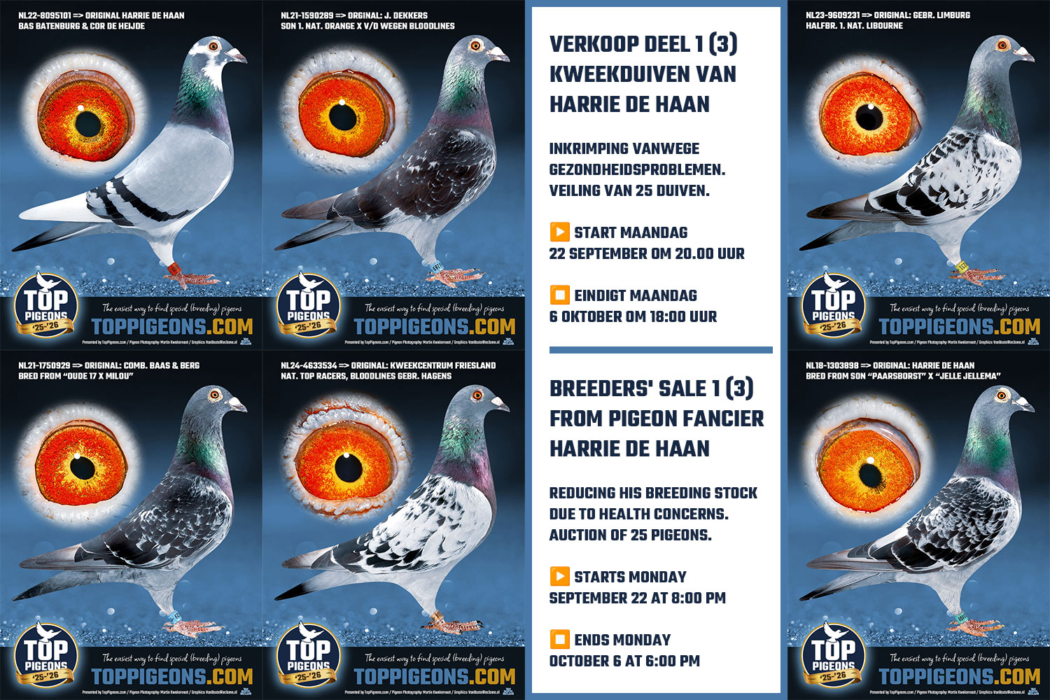 Harrie is selling a large portion of his breeding pigeons on Top Pigeons due to ongoing health issues. He can't completely do without pigeons yet, so he still keeps a few breeding pairs from his own old lines. Primarily purchased pigeons are being auctioned here. It's not a pleasant occasion for Harrie to part with a large portion of his pigeons. However, it's a great opportunity for you to acquire something interesting to add to your breeding loft.