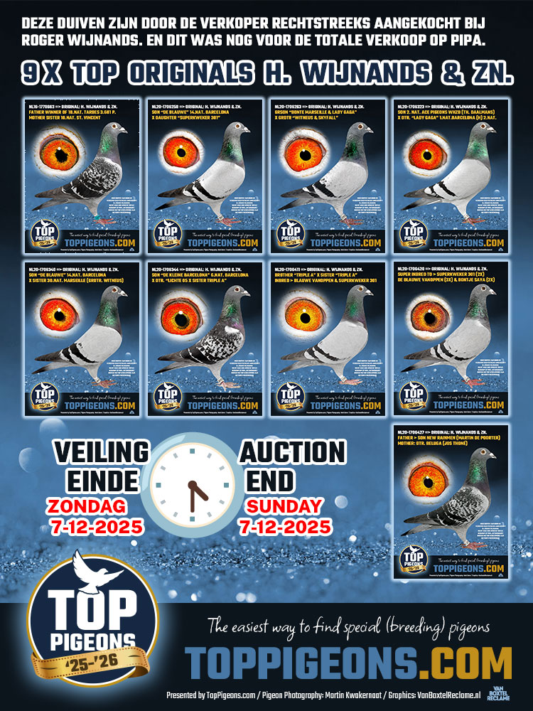 Deze duiven zijn door de verkoper rechtstreeks aangekocht bij Roger Wijnands. En dit was nog voor de totale verkoop op PIPA. Interessante duiven met top afstamming zijn nu voor u bereikbaar.