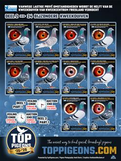 De Noël Peiren NL17-1618999 werd winnares van de 1e GRAND PRIX St. Vincent (1183 km) 2021 en de “Nachtvlieger Peiren” speelde hij in 2019 de 1e NPO LIMOGES 875 km afd. 11 op 1153 duiven. 2e totale concours afd. 7, 8, 9, 10, 11. Deze doffer vloog de 13e zone 4 Periqueux op 1269 duiven 2018. 2x mee en 2x kop en daarna op de kweek! Ook de NL19-1218874 speelde in 2021 de 10e GRAND PRIX '21 Bergerac 1037 km op 2280 duiven en de 8e TXT op Periqueux 965 km NU op 1055 duiven '21. In totaal 7x mee op de Fond en 7x prijs! Als jaarling 4x dagfond 4e asduif in het samenspel. 3x overnacht 2x Teletekst en 100% prijs. Ook dit is een pure Noël Peiren duivin. De “Cahorsduivin” NL22-8052070. Ze speelde 1e in NIC Drachten tegen 322 duiven, 1e jaarling duivin van sector 4, 1e duif van de Friese Fondclub en 2e GRAND PRIX van afd. 11 op 802 duiven op een zware vlucht van 1077 km. En natuurlijk de PURE Jellema de “BOUWVAKKER” die 9 op 9 vloog en altijd vroeg op St. Vincent en sloot af met de 3e GRAND PRIX 2023.