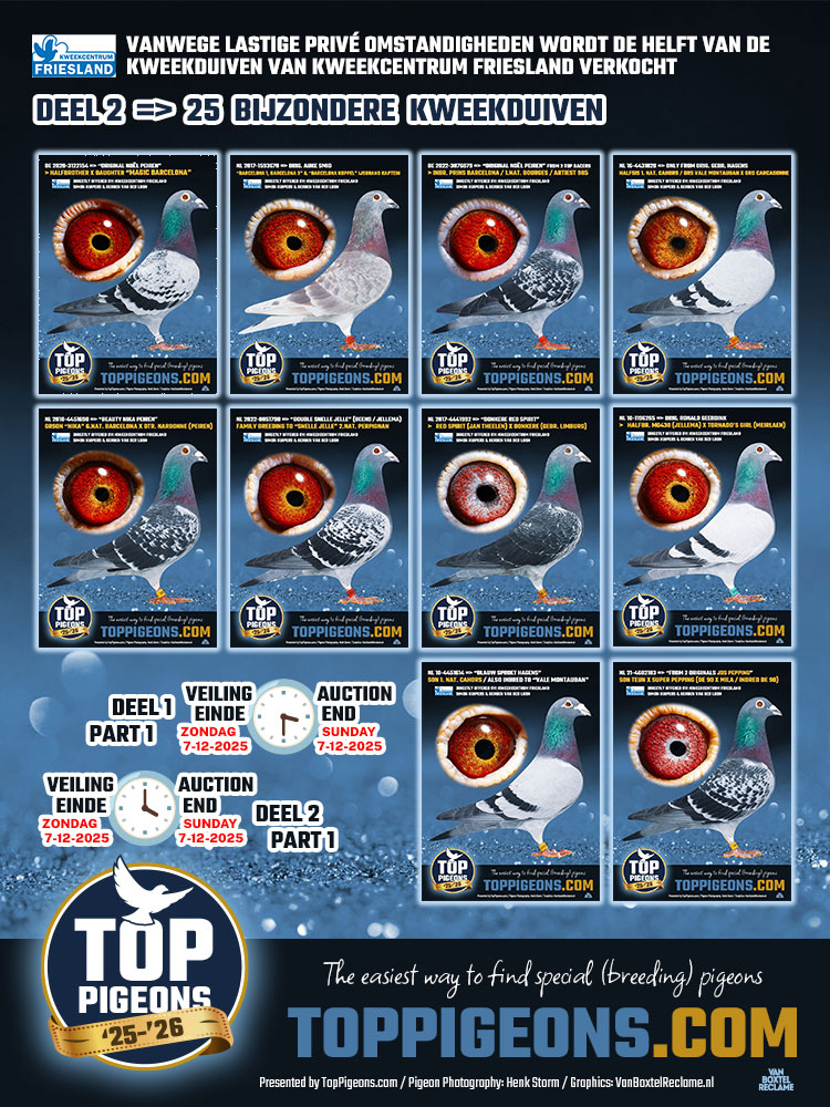 De Noël Peiren NL17-1618999 werd winnares van de 1e GRAND PRIX St. Vincent (1183 km) 2021 en de “Nachtvlieger Peiren” speelde hij in 2019 de 1e NPO LIMOGES 875 km afd. 11 op 1153 duiven. 2e totale concours afd. 7, 8, 9, 10, 11. Deze doffer vloog de 13e zone 4 Periqueux op 1269 duiven 2018. 2x mee en 2x kop en daarna op de kweek! Ook de NL19-1218874 speelde in 2021 de 10e GRAND PRIX '21 Bergerac 1037 km op 2280 duiven en de 8e TXT op Periqueux 965 km NU op 1055 duiven '21. In totaal 7x mee op de Fond en 7x prijs! Als jaarling 4x dagfond 4e asduif in het samenspel. 3x overnacht 2x Teletekst en 100% prijs. Ook dit is een pure Noël Peiren duivin. De “Cahorsduivin” NL22-8052070. Ze speelde 1e in NIC Drachten tegen 322 duiven, 1e jaarling duivin van sector 4, 1e duif van de Friese Fondclub en 2e GRAND PRIX van afd. 11 op 802 duiven op een zware vlucht van 1077 km. En natuurlijk de PURE Jellema de “BOUWVAKKER” die 9 op 9 vloog en altijd vroeg op St. Vincent en sloot af met de 3e GRAND PRIX 2023.