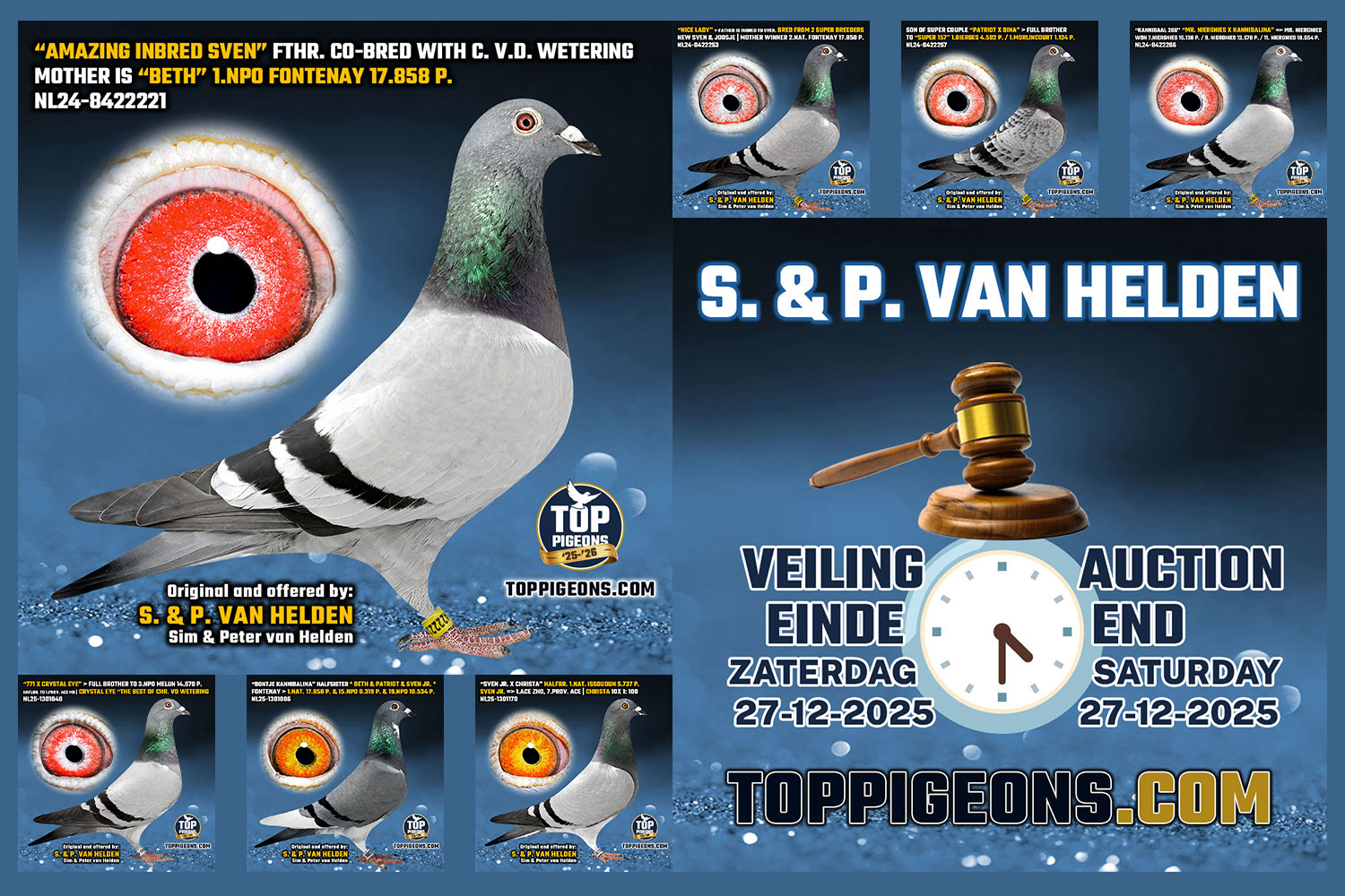 Sim en Peter van Helden behalen al jaren topprestaties. Ze beschikken over een sterke stam duiven die op de vluchten t/m 700km excelleren, opgebouwd met hun fenomenale kweekdoffer "SVEN", vader & (over)grootvader van inmiddels een gigantische lijst met 1e NPO/Provinciaal en samenspel overwinnaars, alsmede vele top 10 NPO winnaars.