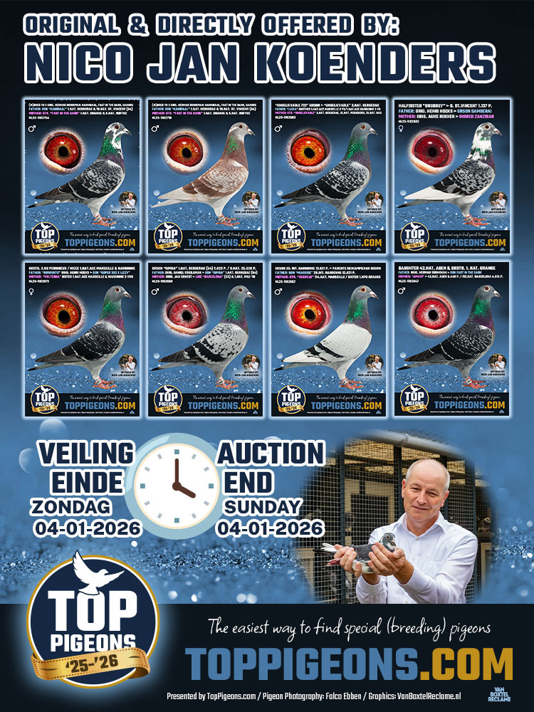 The pigeons will be held by Nico Jan Koenders until after the sale. After purchasing a pigeon, you can arrange to collect it from Nico Jan's home.
