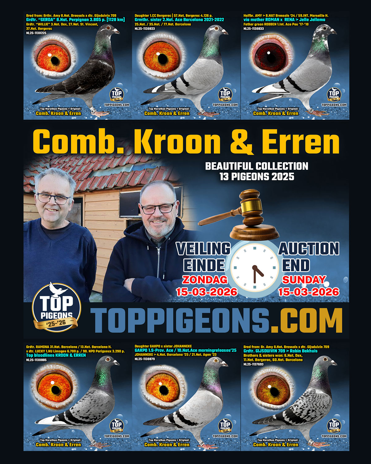 🔥 Top quality from the Kroon & Erren combination now exclusively at Top Pigeons This is a fantastic opportunity for fans of marathon racing, character, and proven performance lines. Through a Top Pigeons partner, a select group of pigeons from the renowned Kroon & Erren combination is being offered – a combination that has guaranteed consistent top performances and a keen eye for quality for years. Now up for auction: 13 pigeons from 2025 with top pedigrees.