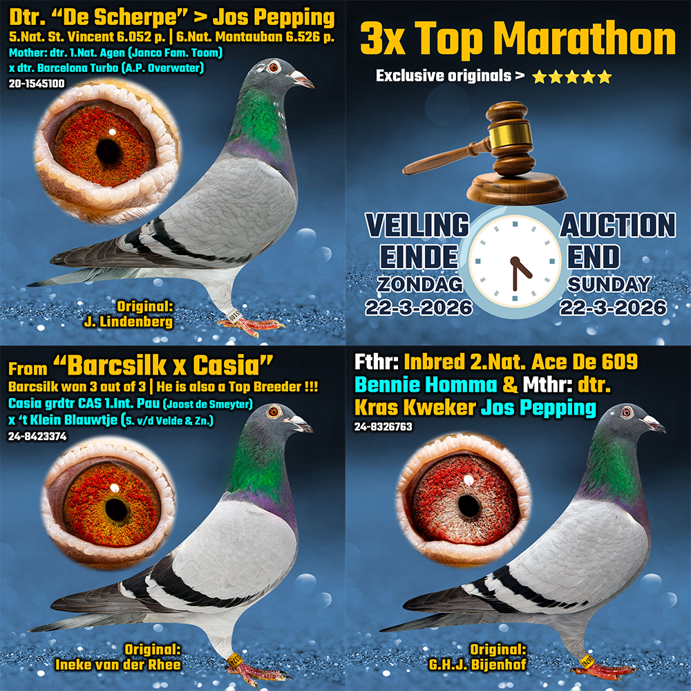 Citaat Ger Bijenhof: “Ik heb best wel de moeite genomen om bepaalde duiven te verzamelen maar ergens moet ik, helaas in dit geval, de keuze maken om afstand te doen van een aantal duiven. Mijn eigen basis duiven blijven en de enkelingen moeten verdwijnen. Met de aangeboden duiven kunnen andere liefhebbers nog zeker mee slagen.”