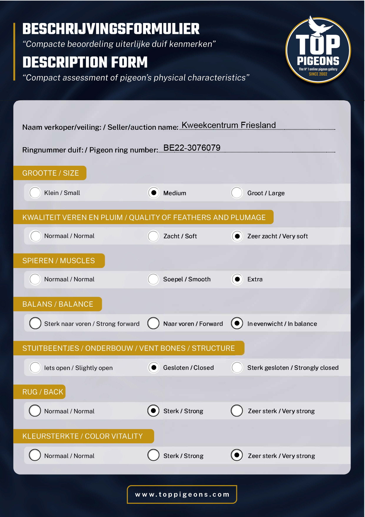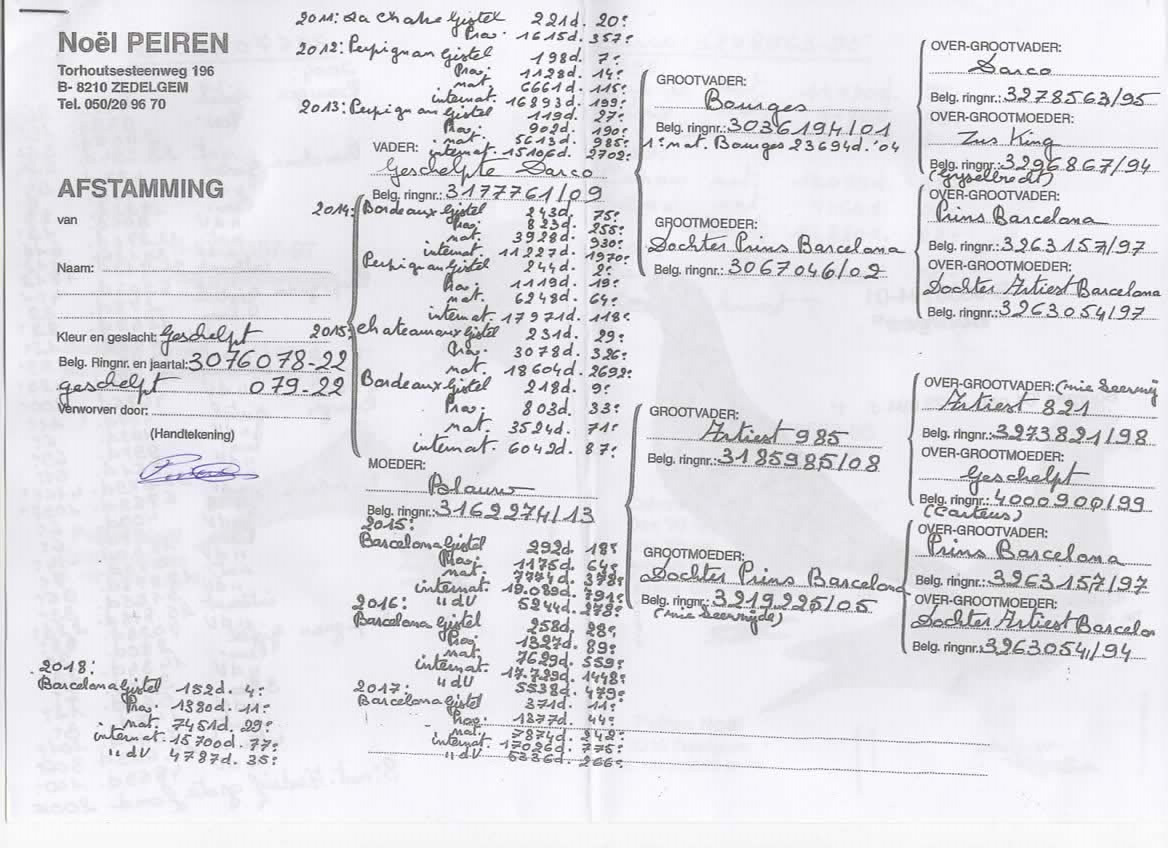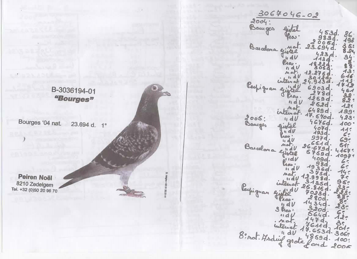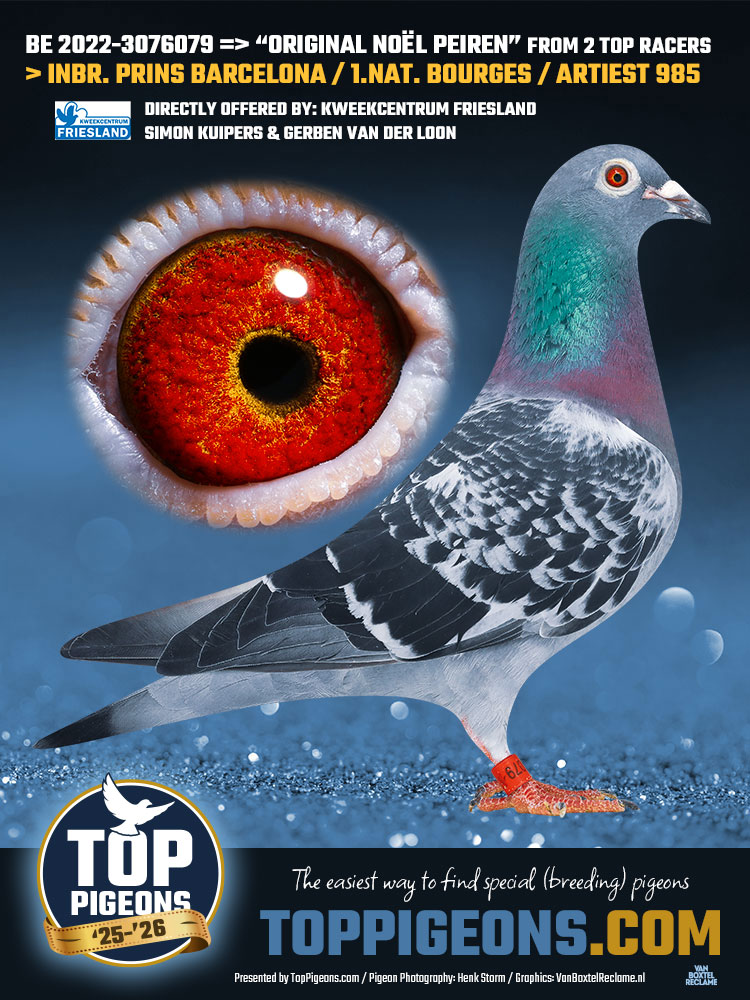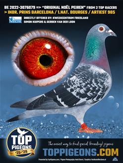 BE22-3076079 kras duivin rechtstreeks van Noël Peiren en is een kleinzoon 1e Nat. Bourges op 23.694 d. Inteelt op Noël zijn stamdoffer PRINS BARCELONA, 7e NAT. op 13.659 d. Veel absolute topvliegers vanuit Barcelona!
