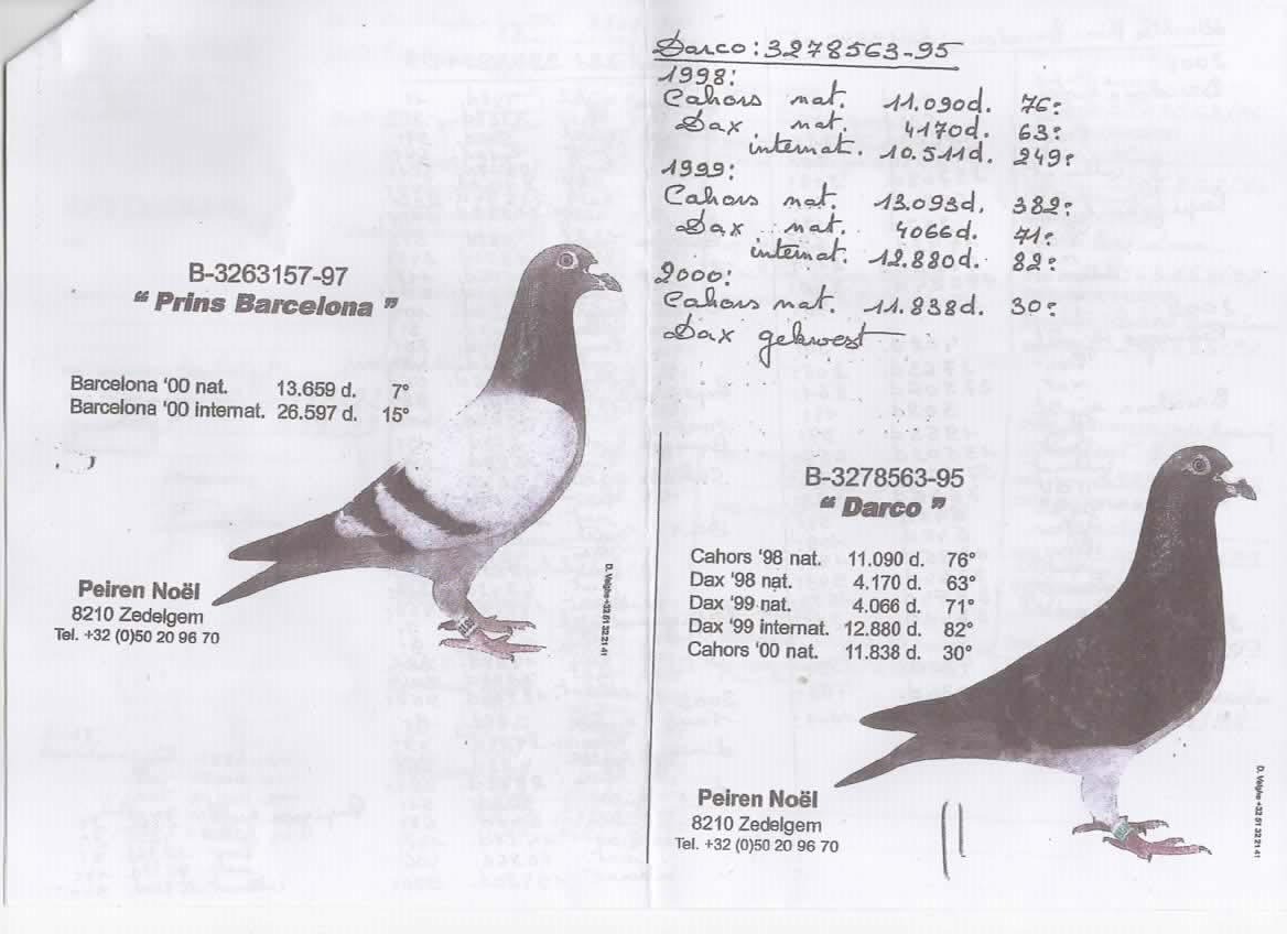 Darco vloog 76e Nat. Cahors 11090 d, 63e Nat. Dax 98 4170d, 71e Nat. Dax 4066 d, 82e Int. Nat. Dax 12880 d. 30e Nat. Cahors 11838 duiven. Hij is vader van de 1e Nat. Bourges. De 1e Nat. BOURGES won deze vlucht op 23.694 duiven. De moeder van 1e Nat. BOURGES is een volle zus van de KING van Gijselbrecht.