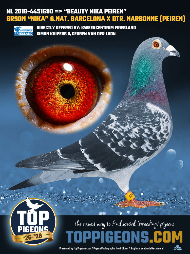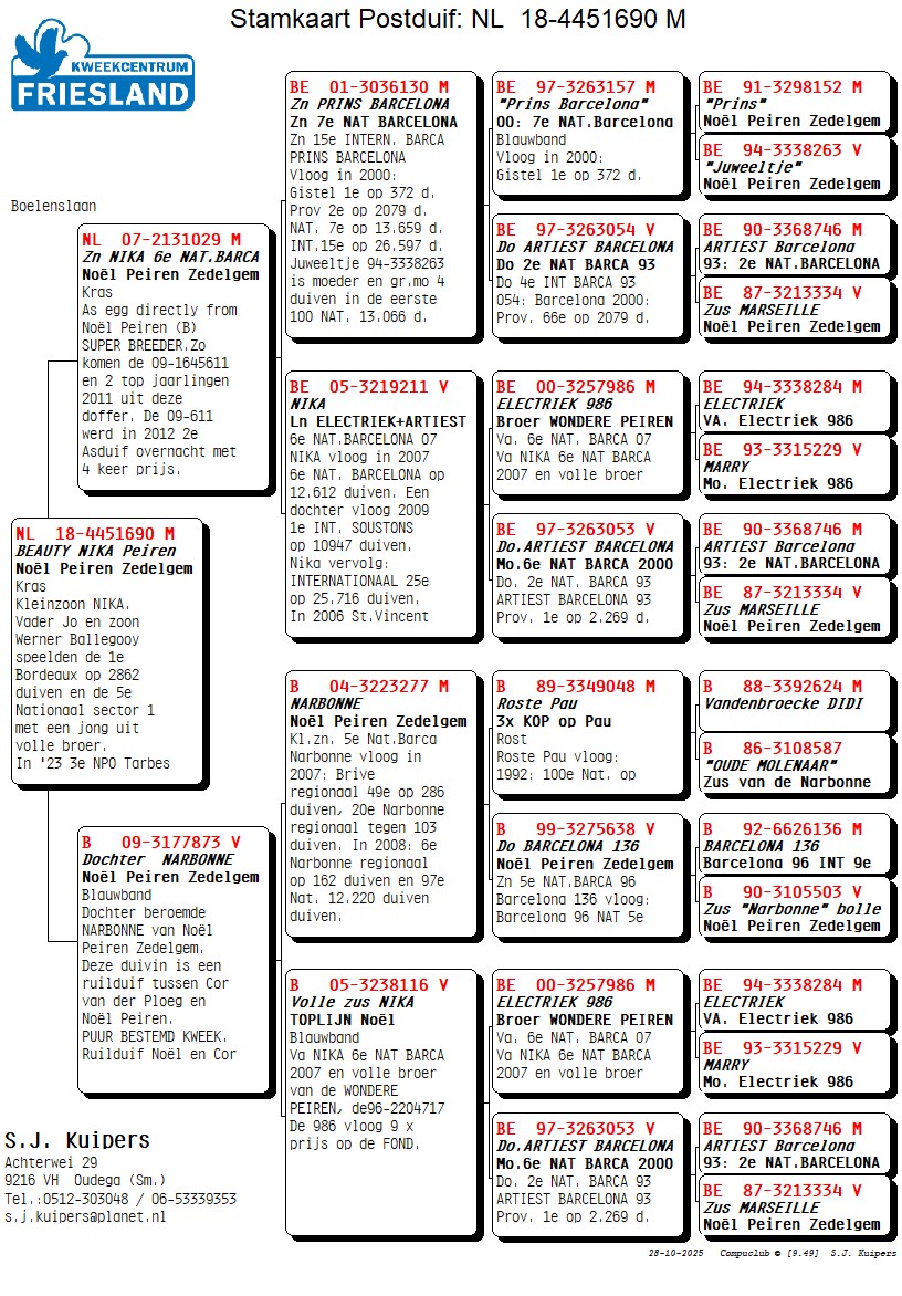 De vader 07-2131029 is een TOP kweker KC en komt rechtstreeks van Noël Peiren uit `NIKA`. Deze duivin won 2007 de 6e NAT. BARCELONA en vloog tegen 12.612 d. en INTERNAT. 25e op 25.716 duiven. Internationaal duivinnen vloog NIKA 6e tegen 6.807 duivinnen. In 2009 vloog een dochter van `NIKA` de 1e Internationaal Soustons tegen 10.947 jaarse duiven. Zij is toen gedoopt als `IKA`. De `PRINS BARCELONA` vloog in 2000 Gistel 1e op 372 duiven, Prov. 2e op 2079 duiven, NAT. 7e op 13.659 duiven en INT. 15e op 25.597 duiven. De `ARTIEST BARCELONA` (90-746) vloog 2e NAT. op Barcelona in 1993 op 13.343 duiven en INTERNAT. was hij 4e tegen 33.145 duiven. Deze doffer zit van zowel de vader als de moederskant in de stamboom. De `NIKA` vloog o.a. In 2006 St. Vincent 2 keer: Prov.160e op 1468 duiven NAT. 1048e op 7525 duiven en Prov.33e op 954 duiven NAT. 147e op 4679 duiven INT. 151e op 5409 duiven INT. duivinnen vloog ze 42e op 1160 duiven. De vader van `NIKA` is een volle broer van de `WONDERE PEIREN`, de96-2204717 van Bert Saarloos. Deze doffer werd in 1999 Wereldkampioen Grote Fond en Nat. Duifkamp NPO Fond met de volgende prijzen: 8e NAT. St. Vincent 8.556 duiven, 12e NAT. DAX 5.856 duiven, 6e NAT. Bergerac op 14.284 duiven. De `ELECTRIEK` 986 vloog zelf ook 9 x prijs op de grote fond.