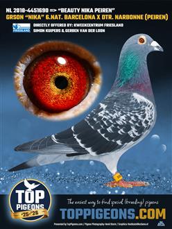 NL18-4451690 kras doffer is familieteelt op NIKA`. Zij won de 6e NAT. BARCELONA op 12.612 duiven. Haar dochter vloog de 1e Internationaal Soustons tegen 10.947 duiven. Gekweekt voor de kweek omdat de ouders al op leeftijd zijn.
