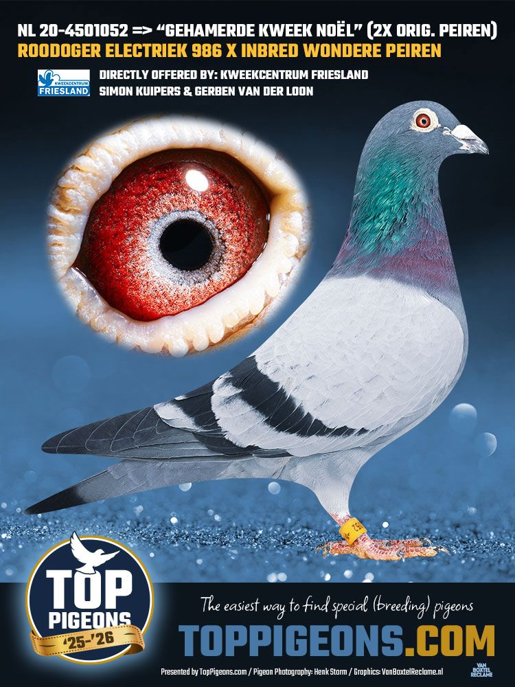 8e TXT op Periqueux 965 km NU op 1055 d duiven '21. Ze komt rechtstreeks van Noël Peiren Zedelgem (B) uit de lijn van de WONDERE PEIREN. Hij vloog 8e Nat. St. Vincent 8556 d. 12e Nat. DAX 5856 d. en 6e Bergerac 14284 d. Hij werd WERELDKAMPIOEN Grote Fond UL Nationaal en duifkampioen NPO grote fond.
