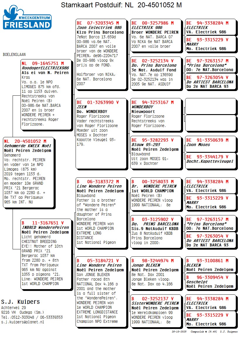 De vader 09-1645751 Roodoger ELECTRIEK komt als ei rechtstreeks van Noël Peiren. Hij is ook de vader van de 1e NPO LIMOGES 875 km afd. 11 op 1153 pigeons en 2e van geheel Nederland afd. 7, 8, 9, 10, 11. Vloog ook 13e in zonde 4 Periqueux op 1269 duiven 2018