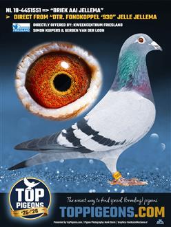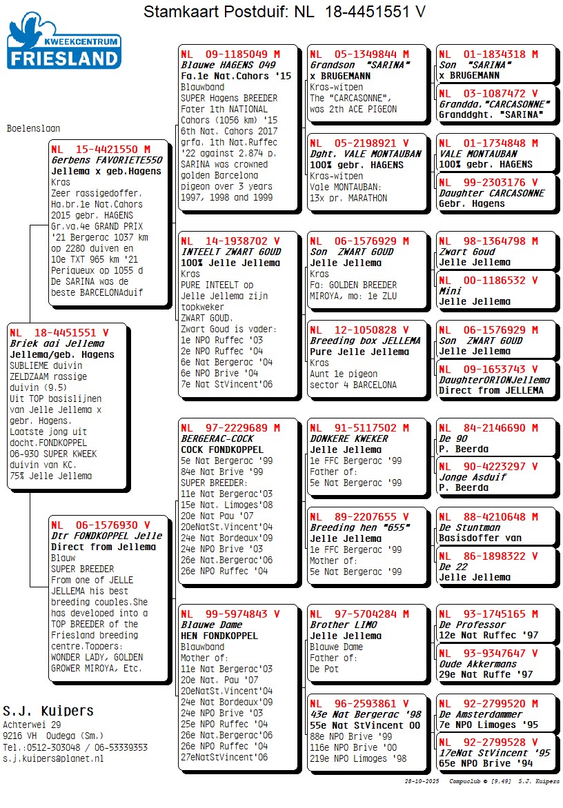 DE MOEDER IS ONZE STAMDUIVIN 06-930 UIT HET FONDKOPPEL VAN JELLE en de vader is een halfbroer 1e Nat. Cahors 2015 en 6e Nat. Cahors 2017. De 15-4421550 is één van onze favoriete kweekdoffers en komt uit het beste van Jelle Jellema keer onze succesvolle gebr. Hagens lijn. De 09-1185049 is ook vader van de 1e Nat. Cahors (1056 km) 2015 en van SONJA, 6e TXT CAHORS 2017. Een pure familieteelt op de basislijnen v.d. gebr. Hagens. In de stamboom zitten `Sarina` (Gouden Barcelona duif over 3 jaar), `Lucinda` (6e NAT. Barcelona), `Carcassonne` (2e ASDUIF ZLU) en de `Vale Montauban`. Uit de nestbroer van de 09-1185049, de 09-050 komt Simon zijn beste vliegduivin `Pareltje Hagens` die o.a. 9e Teletekst op Dax (1168 km) vloog. In 2020 vloog SUPERTJE uit 2x TXT (18-1431131) 3x mee op de fond waarvan 3x prijs en 8e Teletekst Bergerac (1005 km) zone 4 NU. De 14-1938702 is sterk ingeteeld op Zwart Goud. De 06-1576929 is een rechtstreekse zoon van Jelle zijn `ZWART GOUD` keer `MINI`. Dit is onze Jellema STAMDOFFER. Hij was gekoppeld met de 12-1050828, dat is zijn eigen dochter x een dochter van de ORION. De ORION is ook weer een zoon van ZWART GOUD. De moeder 06-1576930 komt uit Jelle zijn BASISKOPPEL, het zgn. `FONDKOPPEL`. Dit is een super kweekduivin. Haar vader is de `BERGERAC-doffer`, hij vloog o.a.: 1e FFC Bergerac 1999. 5e Nat Bergerac 1999. 84e Nat Brive 1999. Tevens is hij de vader van: 11e Nat. Bergerac 2003, 20e Nat. St. Vincent 2004, 24e NPO Brive 2003, 26e Nat. Bergerac 2006, 26e NPO Ruffec 2004, 27e Nat. St. Vincent 2006, 28e Nat. Bergerac 2005. De moeder is de `BLAUWE DAME` en zij kweekte: 11e Nat. Bergerac 2003. 20e Nat. St. Vincent 2004. 24e NPO Brive 2003. 25e NPO Ruffec 2004. 26e Nat. Bergerac 2006. 26e NPO Ruffec 2004. 27e Nat. St. Vincent 2006. 28e Nat. Bergerac 2005. Ze is ook de moeder van GOUDEN KWEKER MIROYA, moeder 1e ZLU Agen Noord 2015 en grootmoeder van `WONDER LADY, zij vloog 1e Perpignan 1133 km sector 3 en 4 en 4e Internationaal tegen 12.353 d. 2018 en 1e Nat. Pau sector 4 en 18e Nat. Pau 1132 km ZLU. 3785 d. 2019 van Jaap Mazee. Ook Simon zijn Witstaart Jellema komt uit de 06-930, ze won o.a. 5e Nat. Orange (1005 km) sector 4 en TELETEKST in 2015 en 12e St. Vincent (1180 km) FFC 2016.