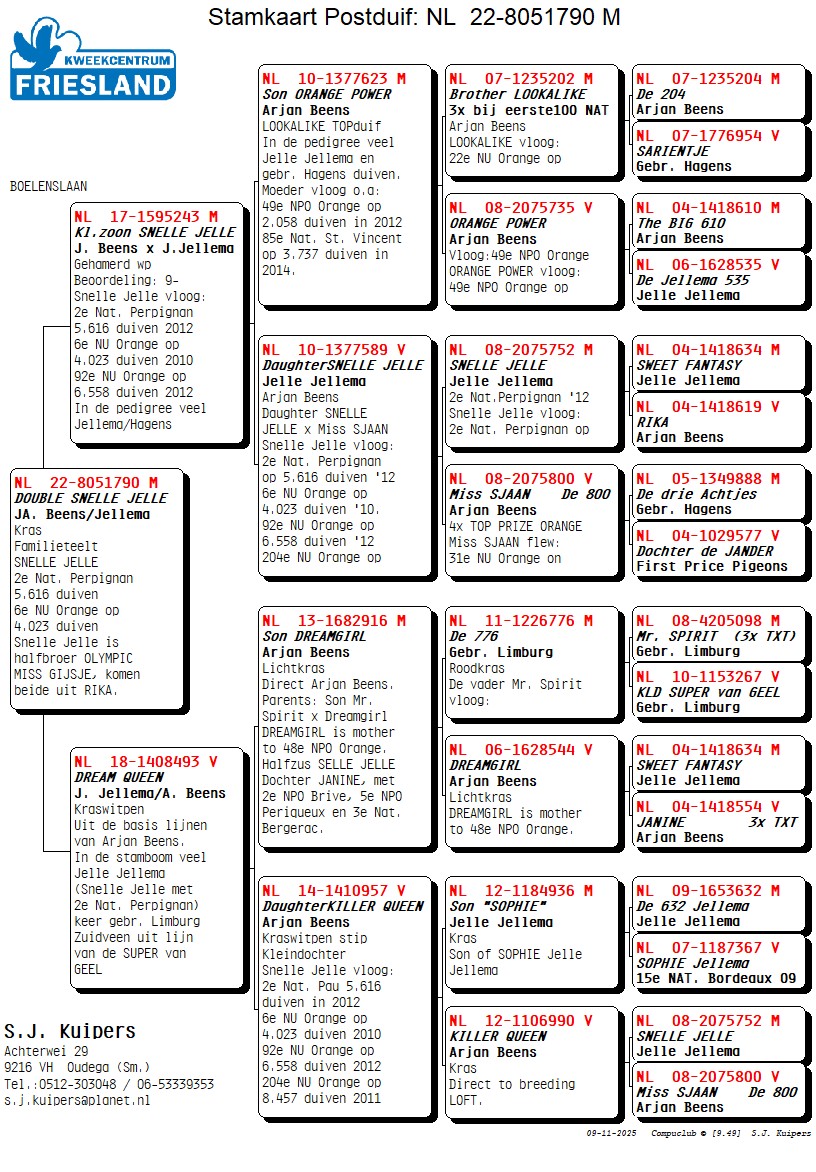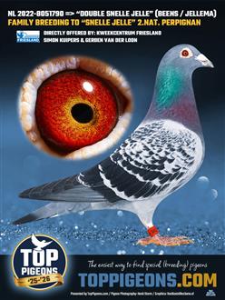 SNELLE JELLE is een zoon van de beroemde ‘RIKA’ 04-1418619, de 1e NPO Periqueux '07op 7.581 duiven. RIKA komt weer uit 2 rechtstreeks Jellema’s, de POWER 019 x LEONTIEN. Snelle Jelle vloog o.a.: 2e Nat. Pau op 5.616 duiven in 2012, 6e NU Orange op 4.023 duiven '10. RIKA is ook moeder van: 08-2075874 OLYMPIC MISS GIJSJE 1e cat. E Olympiade Nitra in Slowakije 2013, 2e Nat. Perpignan 12 op 5.608 duiven, 6e NU Orange '10 op 4.023 duiven, 6e NU Brive '10 op 18.246 duiven. 7e NU Montpellier '11 op 10.253 duiven, 7e Nat. Cahors '10 op 11.054 duiven.