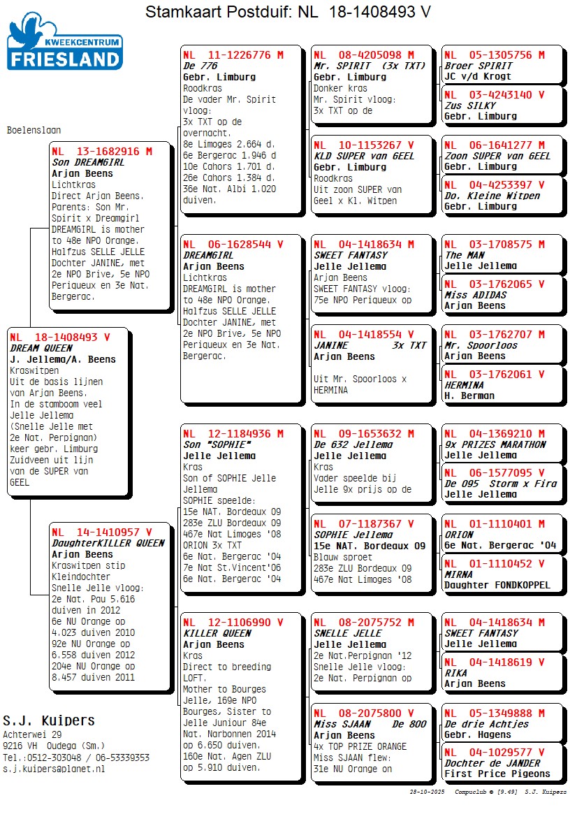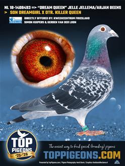 NL18- 1408493 Uit de basis lijnen van Arjan Beens met veel Jelle Jellema. Snelle Jelle met 2e Nat. Perpignan keer gebr. Limburg Zuidveen uit lijn van de SUPER van GEEL. Snelle Jelle is halfbroer OLYMPIC MISS GIJSJE, komen beide uit RIKA.