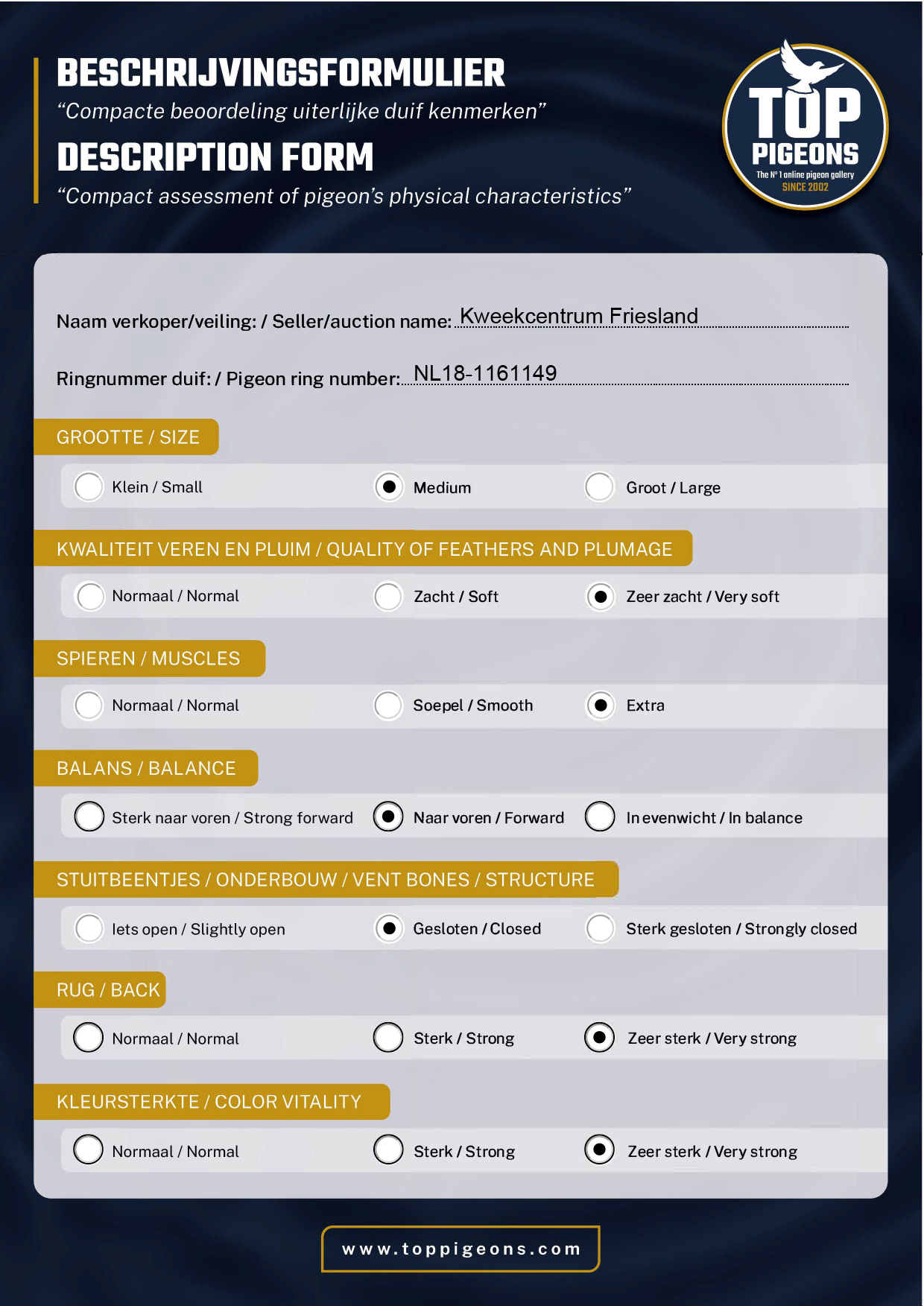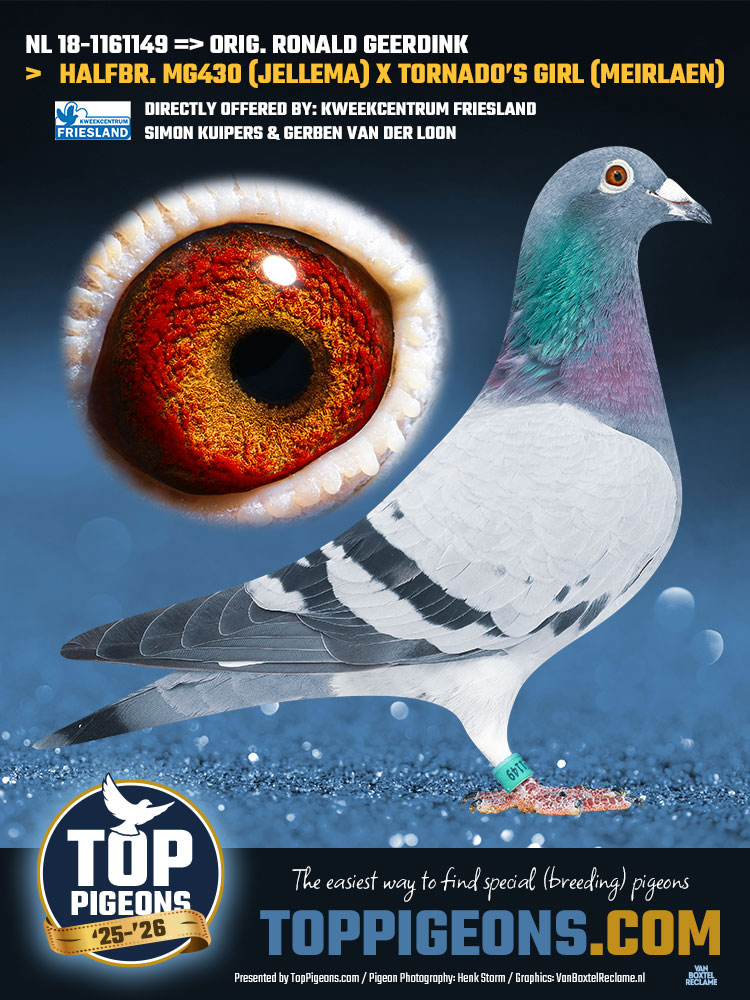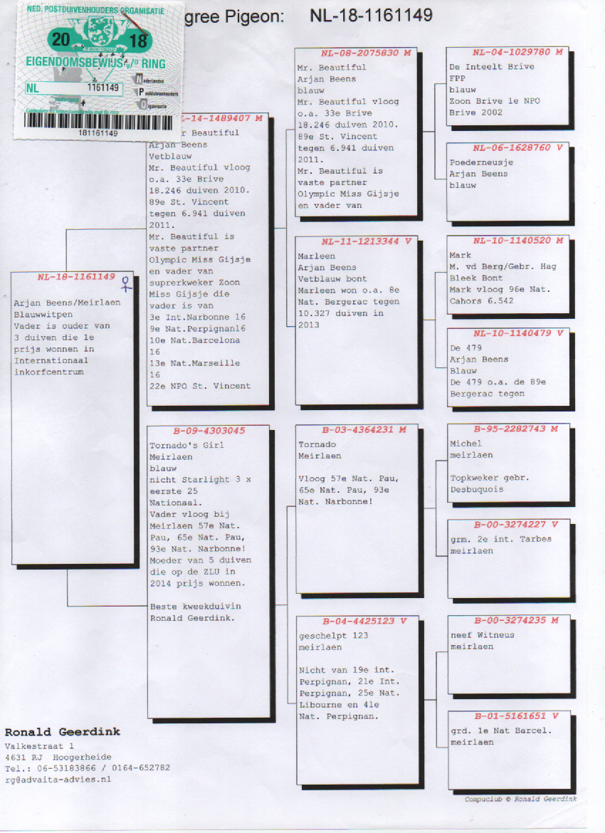 De NL 18-1161149 is een blauwband witpen duivin van Ronald Geerdink uit een zoon van Mr. Beautiful van Arjan Beens x de beste kweekduivin van Ronald Geerdink van Etienne Meirlaen. Mr. Beautiful is vader van de SUPER KWEKER OMG 430 bij Jelle Jellema en is de vaste partner van Olympic Miss Gijsje.