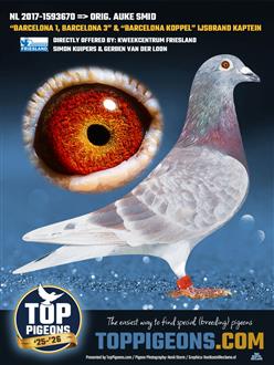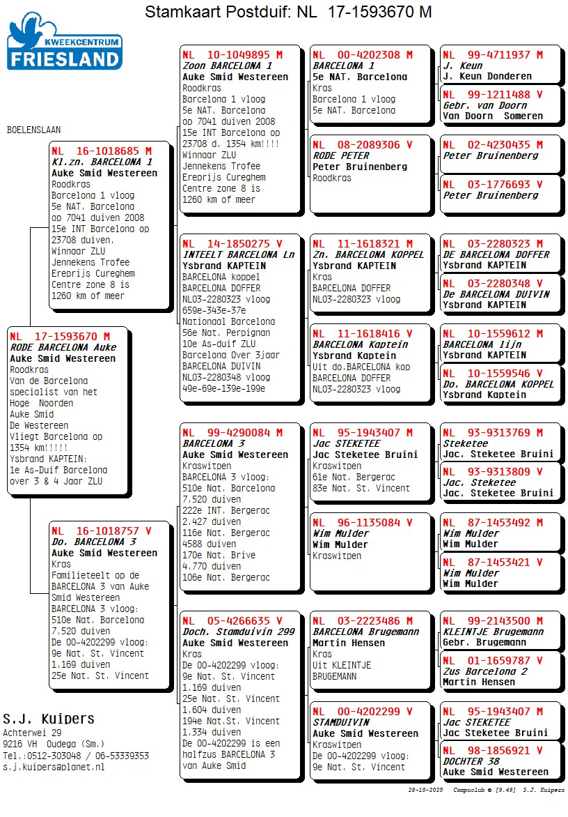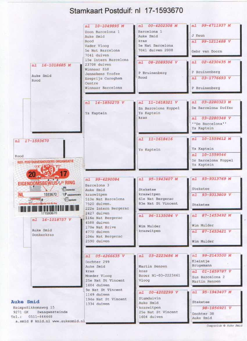 NL17- 1593670 Roodkras doffer RODE BARCELONA van Auke komt van de van de Barcelona specialist van het Hoge Noorden. Auke Smid De Westereen Vliegt Barcelona op 1354 km!!!!! Vader lijn BARCELONA 1, hij won 5e NAT. Barcelona op 7041 duiven x Barcelonakoppel Ysbrand KAPTEIN. De moeder is familieteelt op de BARCELONA 3 x de STAMMOEDER, zij vloog o.a. 9e Nat. St. Vincent 1.169 duiven.