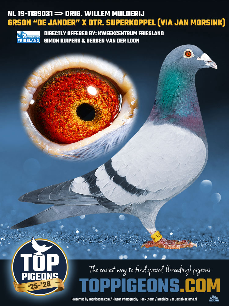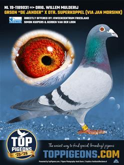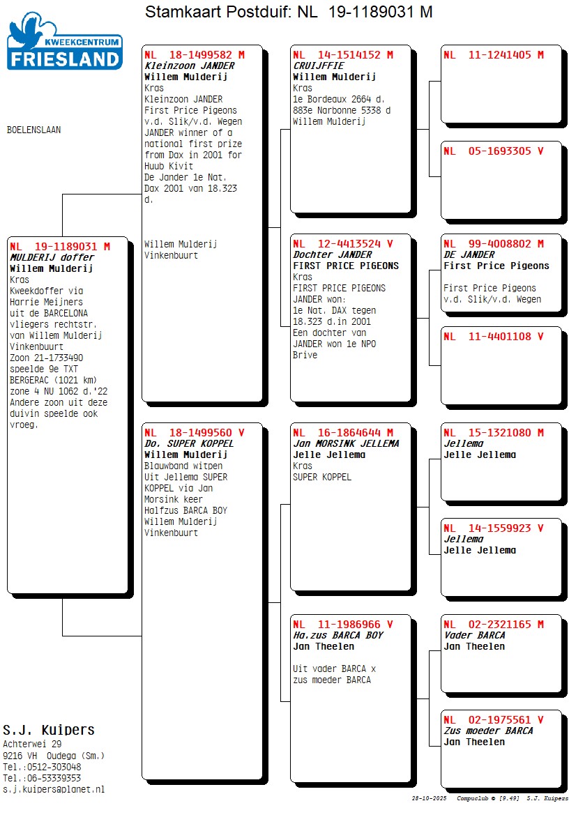 De zoon 21-1733490 speelde 9e TXT BERGERAC zone 4 NU 1062 d. 2022. Kweekdoffer komt rechtstreeks van Willem Mulderij Vinkenbuurt via Harrie Meijners Feanwalden. De vaderlijn komt van de JANDER 12-4413524 v.d. Slik/v.d. Wegen komt via FIRST PRICE PIGEONS. JANDER won 1e Nat. DAX tegen 18.323 d. in 2001. Een dochter van JANDER won 1e NPO Brive. CRUIJFFIE 14-1514152 won 1e Bordeaux 2664 d. 883e Narbonne 5338 d. bij Willem Mulderij. De moederlijn van de 18-1499560 komt uit het Jellema SUPER KOPPEL via Jan Morsink keer halfzus BARCA BOY.