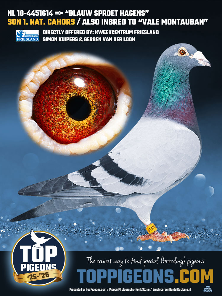 NL18-4451614 Blauwwitpen doffer is een zoon van de 1e Nat. Cahors 2015 sector 4 op 1.487 d. De moeder komt uit de beroemde “Vale Montauban” van Ronald Geerdink met een volle zus (INTEELT br. X zus). De “Vale Montauban” zit ook in de 1e Nat. Cahors 2015. GEKWEEKT VOOR DE KWEEK!