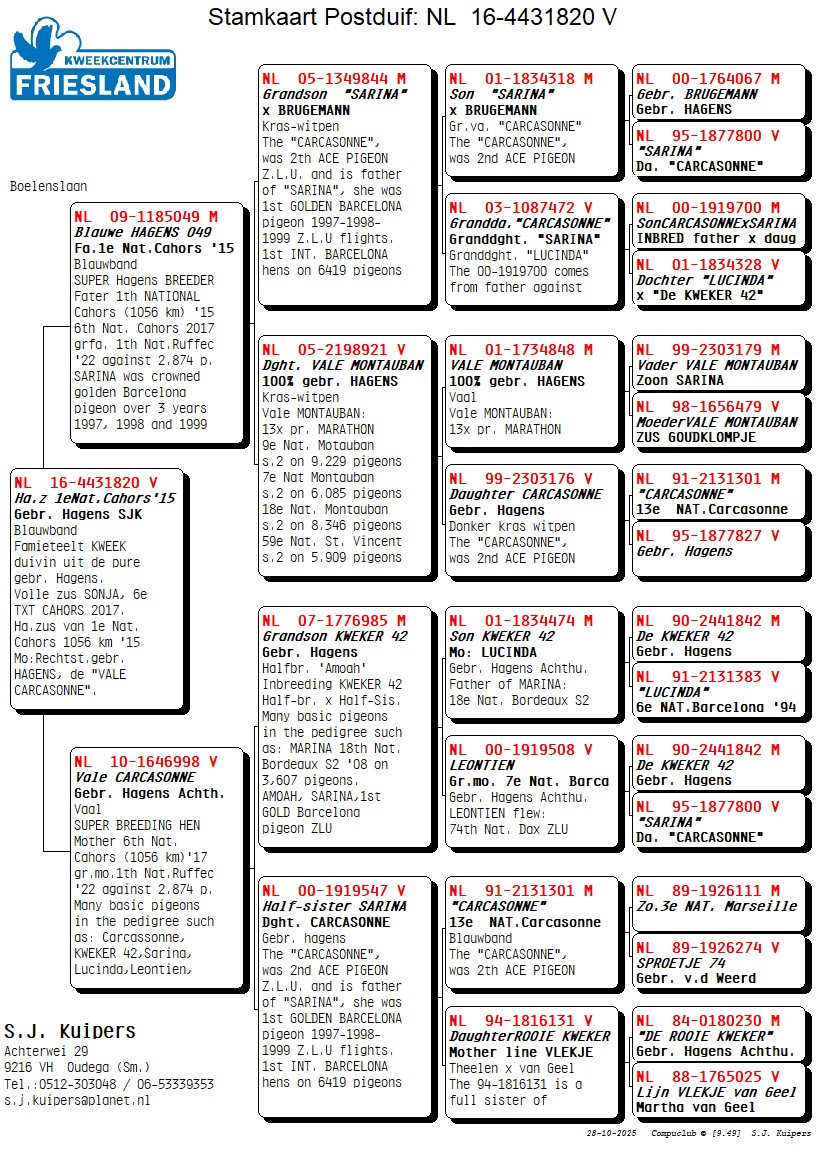 De vader 09-1185049 is vader van de 1e Nat. Cahors (1056 km) 2015 en van SONJA, 6e TXT CAHORS 2017. Een pure familieteelt op de basislijnen v.d. gebr. Hagens. In de stamboom zitten `Sarina` (Gouden Barcelona duif over 3 jaar), `Lucinda` (6e NAT. Barcelona), `Carcassonne` (2e ASDUIF ZLU) en de `Vale Montauban`. Sonja vloog in 2017: 6e afd. 11 op 880 d. 3e zone 4 N.U. 773 duiven en 7e sector 4. Ze vloog ook prijs op Chateauroux (769 km).