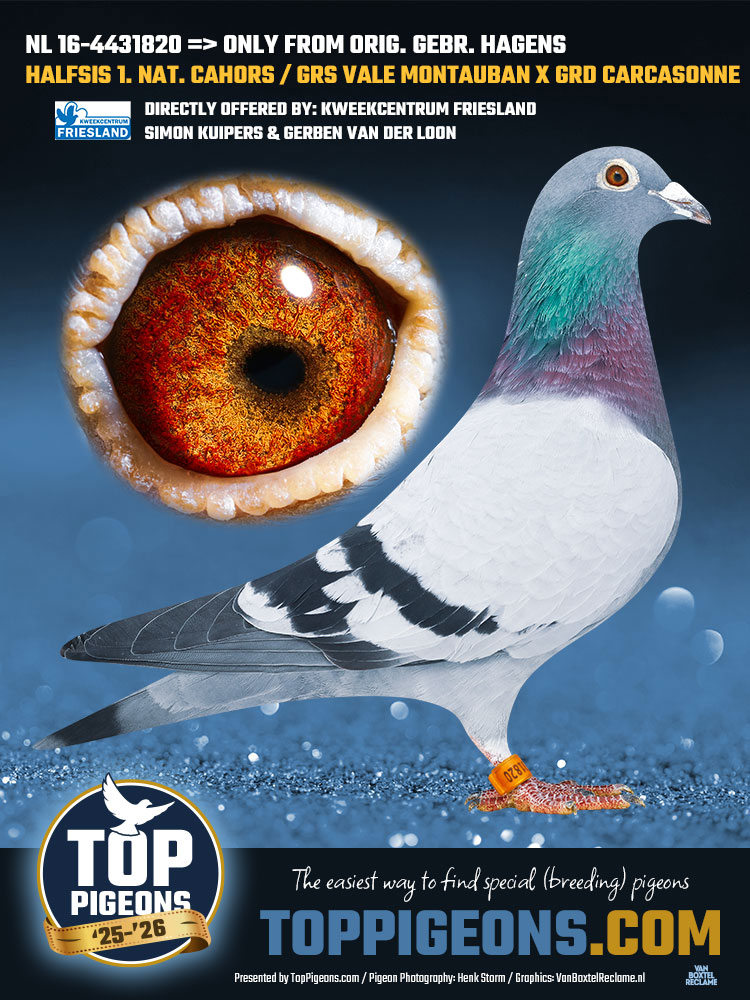 NL 16-4431820 Blauwband duivin is een volle zus van SONJA. Ze vloog als jaarling 6e TXT CAHORS 2017 en is halfzus 1e Nat. Cahors (1056 km) 2015. De vader is inteelt op de lijn van de `Sarina` `Carcassonne` (2e ASDUIF ZLU) en de `Vale Montauban`. De moeder, de ‘Vale Carcassonne’ komt rechtstreeks van gebr. Hagens Achthuizen.