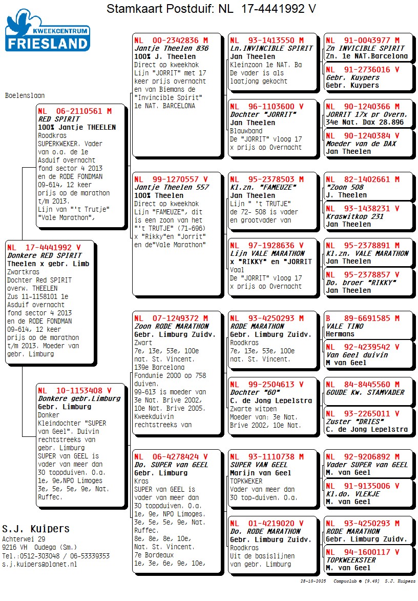 De vader is de beroemde `RED SPIRIT` de Theelen topkweker van kweekcentrum Friesland. Zie voor informatie bij de vader 15-4421561. De moeder 10-1153408 is een rechtstreekse duivin van gebr. Limburg uit Zuidveen. Deze is speciaal aangekocht om te koppelen tegen onze Red Spirit. Ze komt uit de lijn van de RODE MARATHON x SUPER van GEEL, hij is vader van meer dan 30 top duiven. Veel Theelen in deze lijn. Van vaderskant uit de `zoon Rode Marathon`, die vloog o.a. 7e, 13e, 53e, 100e nat. St. Vincent. 139e Barcelona Fondunie 2000 op 758 duiven. 99-613 is moeder van 3e Nat. Brive 2002, 10e Nat. Brive 2005. Kweekduivin rechtstreeks van C. de Jong Lepelstraat. Van moederskant uit de SUPER van GEEL is vader van meer dan 30 topduiven. O.a. 1e, 9e, NPO Limoges. 3e, 5e, 5e, 9e, Nat. Ruffec. 8e, 8e, 8e, 10e, Nat. St. Vincent. 7e Bordeaux 1e, 3e, 6e, 9e, 10e, Periqueux en Brive.