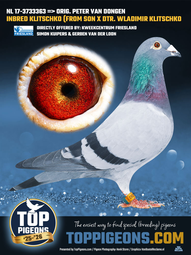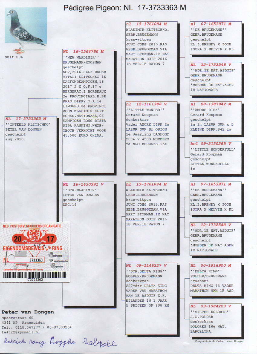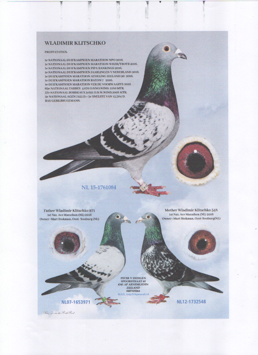 1e Limoges (8e Prov.) Zijn vader is WLADIMIR KLITSCHKO NL-15-1761084 en 1e Nat. ASDUIF MARATHON 2016. 1e Nat. duifkamp.'16, Marathon WHZB/TBOB. Hij komt uit lijnen van Gebr. Brugemann, Va: lijn OUDE 062 en MYRA x Mo: De SANDER x OUDE 062 x CHIBA. WLADIMIR KLITSCHKO is verkocht naar China voor €45.500,--