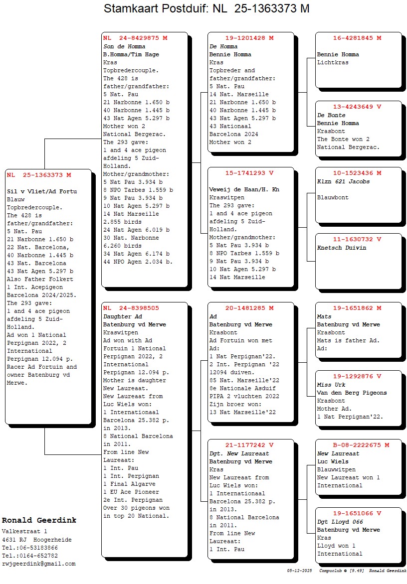 De broer van Ad won: 13 Nat. Marseille 2022, 27 Nat. St. Vincent ZLU 2024, 43 Nat. Marseille 2024, 62 Nat. Agen 2023, 65 Nat. Narbonne 2023 en 75 Nat. Marseille 2022. Moeder van de 1e Nationaal Perpignan is ‘Miss Urk’, superkweekster en dochter van 1e Internationaal Pau en 1e Internationaal Perpignan van van de Berg Pigeons.
