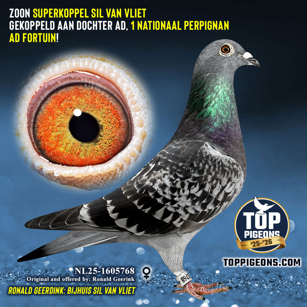 Koop 20 NL25-1605768 kras duivin. Zoon 1 Nationaal Barcelona en 19 Nationaal Perpignan van Sil van Vliet gekoppeld aan dochter Ad, 1 Nationaal Perpignan! Vader NL24-8430300 kocht Ronald Geerdink voor een vermogen met DNA bij Sil van Vliet. Inmiddels heeft Ronald 16 duiven gekocht van alle kopvliegers van deze grote kampioen!
