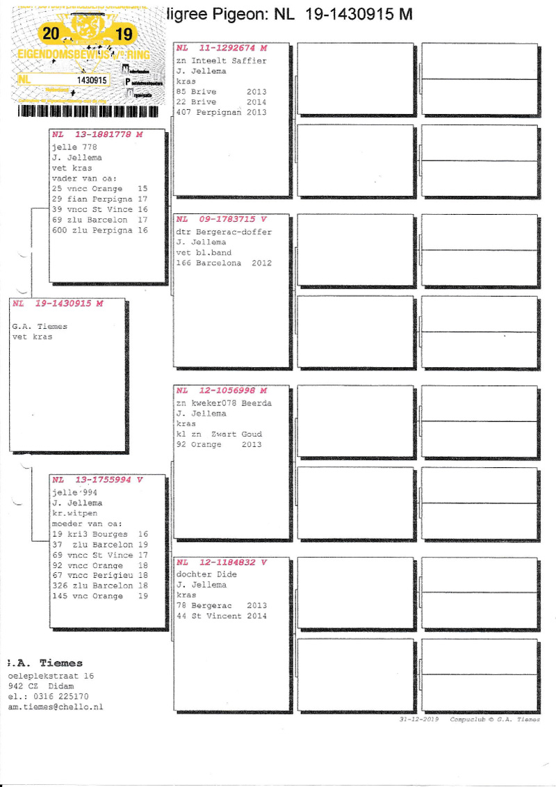 Pedigree G.A. Tiemes, "Treasurekeeper Jellema Pigeons"