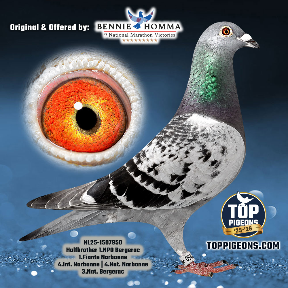 Gr. Sire: NL. 00-4202609 “De 609” October youngster of 2007 has on an old band from 2000 was in 2010 2nd National Ace Pigeon Multi-day long distance.