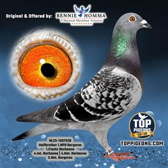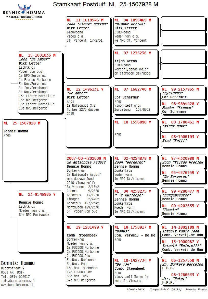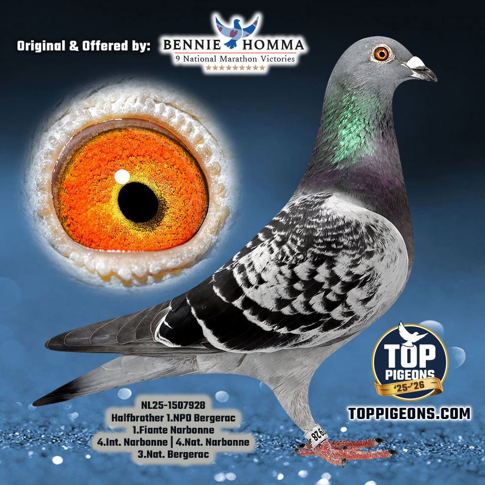 Gr. Sire: NL. 00-4202609 “De 609” October youngster of 2007 has on an old band from 2000 was in 2010 2nd National Ace Pigeon Multi-day long distance.