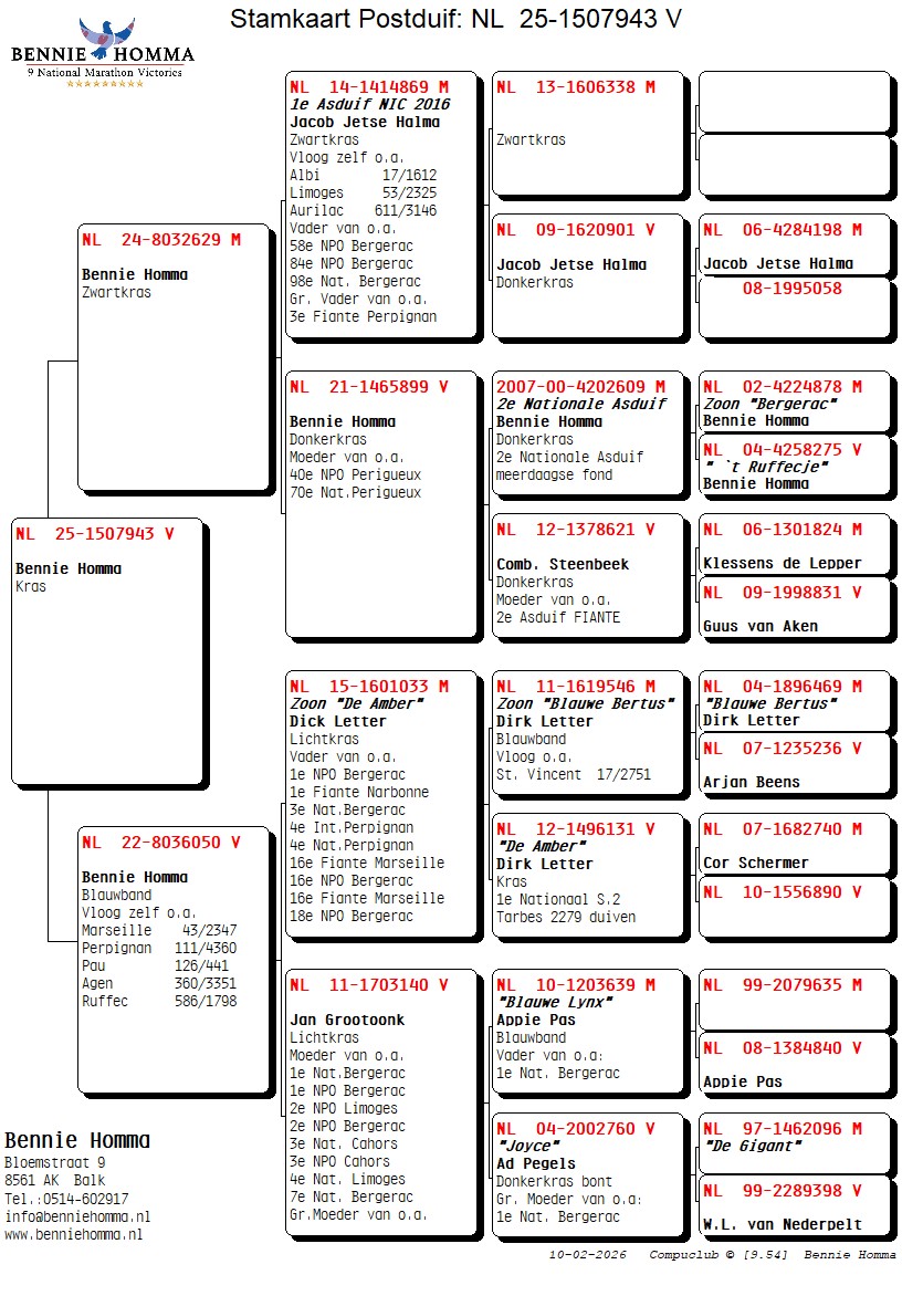 Gr. Sire: NL. 14-1414869 1st Ace Pigeon NIC de ZWH 2016 at Jacob Jetse Halma.