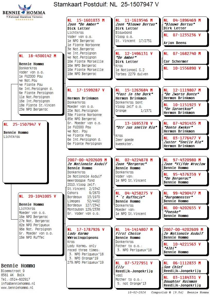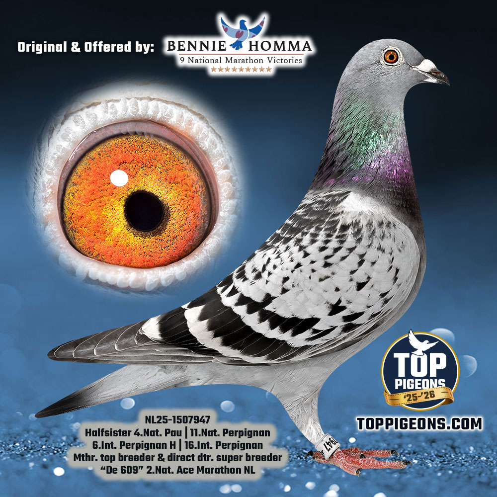 Gr. Sire: NL. 00-4202609 “De 609” October youngster of 2007 has on an old band from 2000 was in 2010 2nd National Ace Pigeon Multi-day long distance.