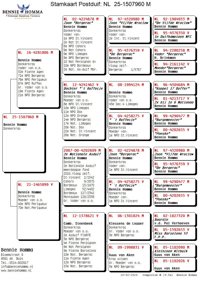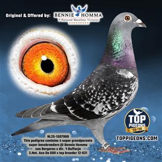 Gr. Sire: NL. 00-4202609 “De 609” October youngster of 2007 has on an old band from 2000 was in 2010 2nd National Ace Pigeon Multi-day long distance.