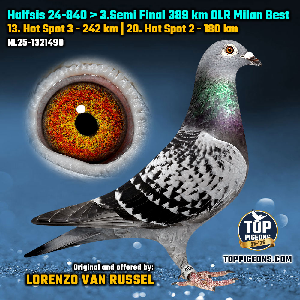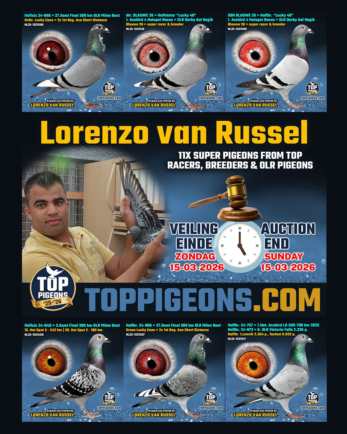 Your current position Home > Auctions > LORENZO VAN RUSSEL ► 11x super pigeons from top racers, breeders & olr pigeons > 2 - NL25-1321490 - Lorenzo van Russel, "Halfsis 24-840"