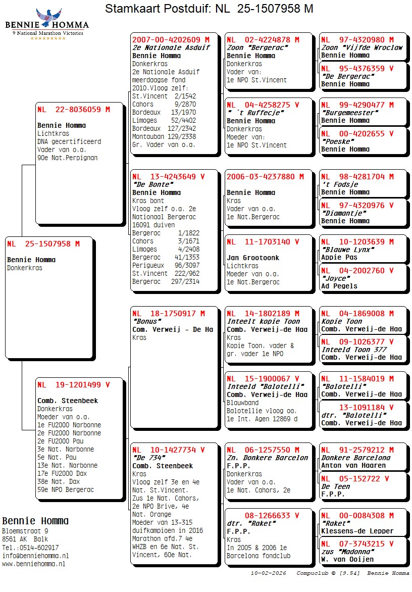 Dam: 19-1201499 direct Comb. Steenbeek & Son de Bilt from “De 754” flew 3rd and 4th Nat. St. Vincent.