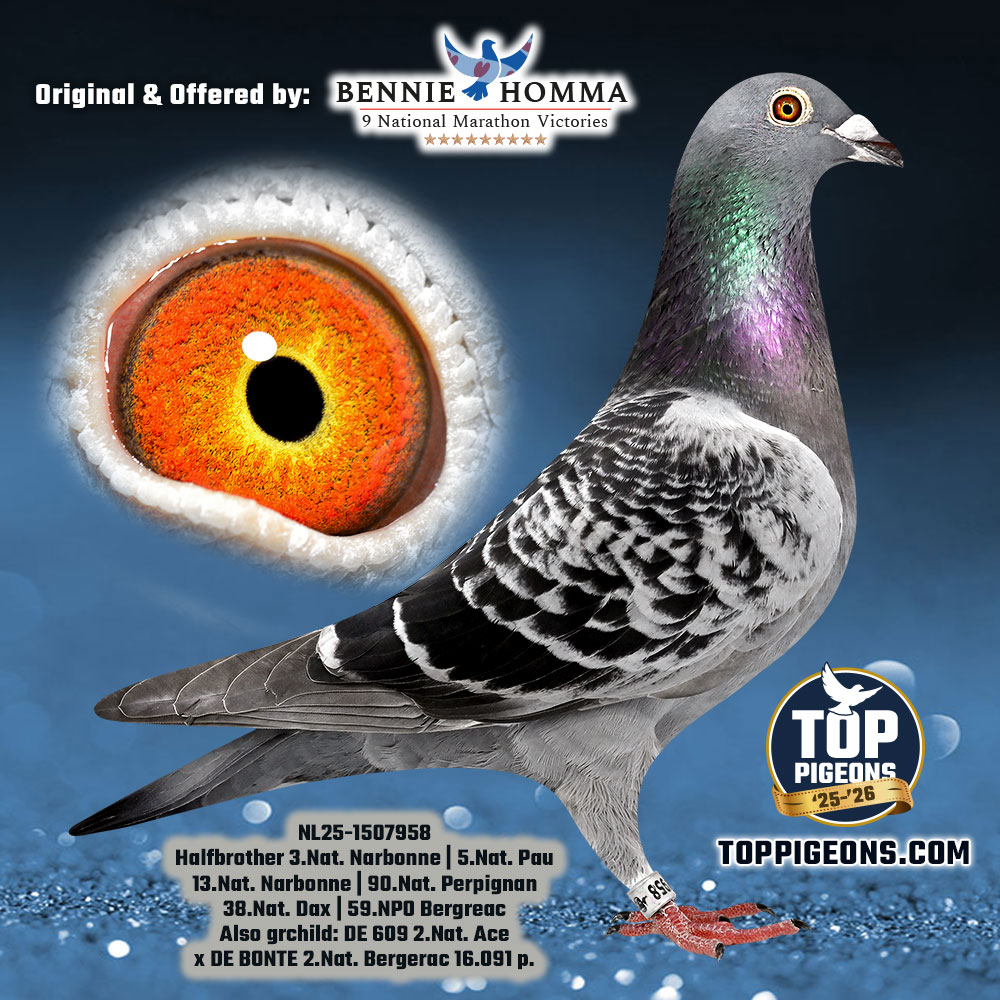Gr. Sire: NL. 00-4202609 “De 609” October youngster of 2007 has on an old band from 2000 was in 2010 2nd National Ace Pigeon Multi-day long distance.