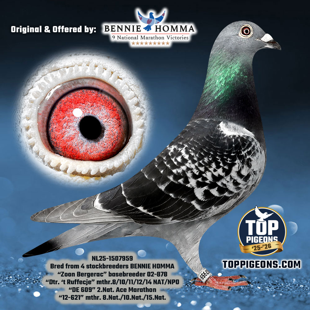 Gr. Sire: NL. 00-4202609 “De 609” October youngster of 2007 has on an old band from 2000 was in 2010 2nd National Ace Pigeon Multi-day long distance.
