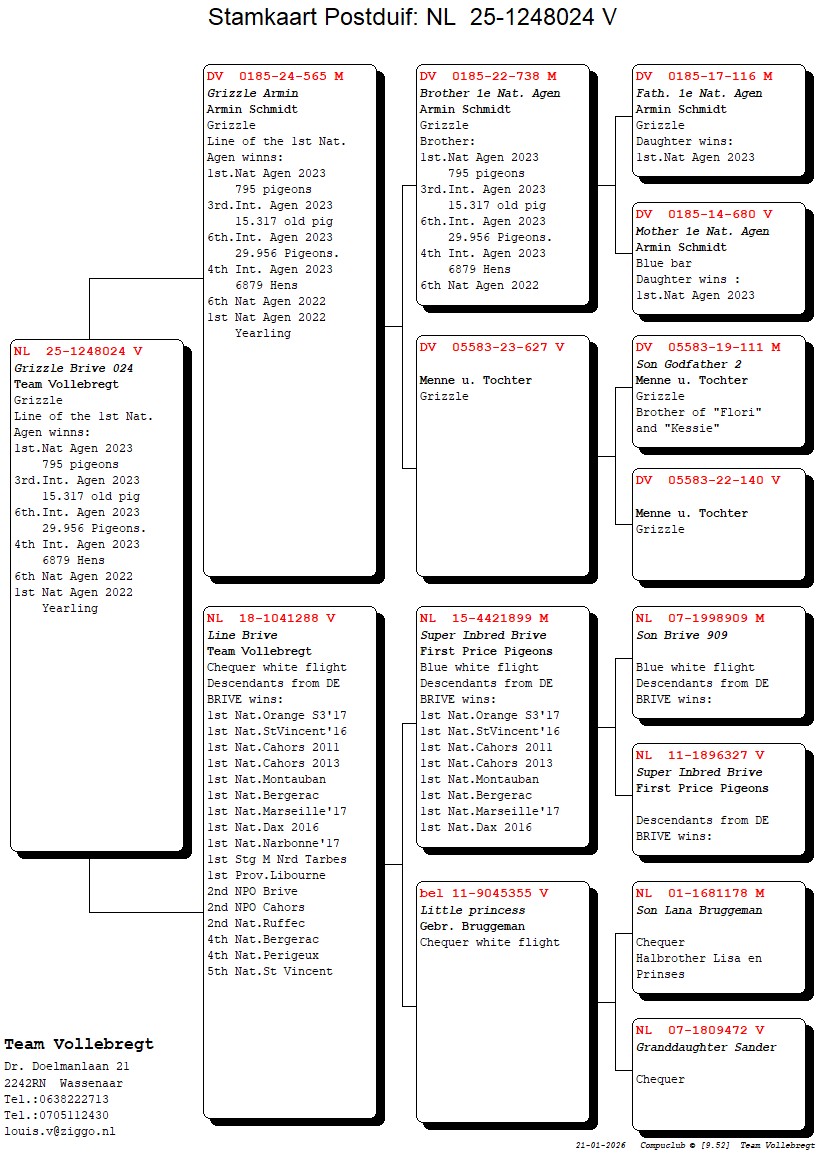 Descendants of “De Brive” win: 1. Nat. Orange, 1. Nat. St. Vincent, 2x 1.Nat. Cahors, . Nat. Montauban, 1. Nat. Bergerac, 1. Nat. Dax,1. Nat. Marseille, 1. Nat. Narbonne, 1. Tarbes Marathon Noord, 1. Prov. Libourne, 2. Nat. Ruffec, 2. NPO Brive, 2. NPO Cahors, 4. Nat. Bergerac and so on