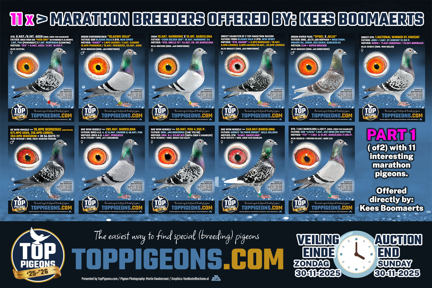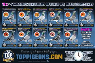 Deze veiling van 22 interessante marathon kweekduiven worden aangeboden door Kees Boomaerts