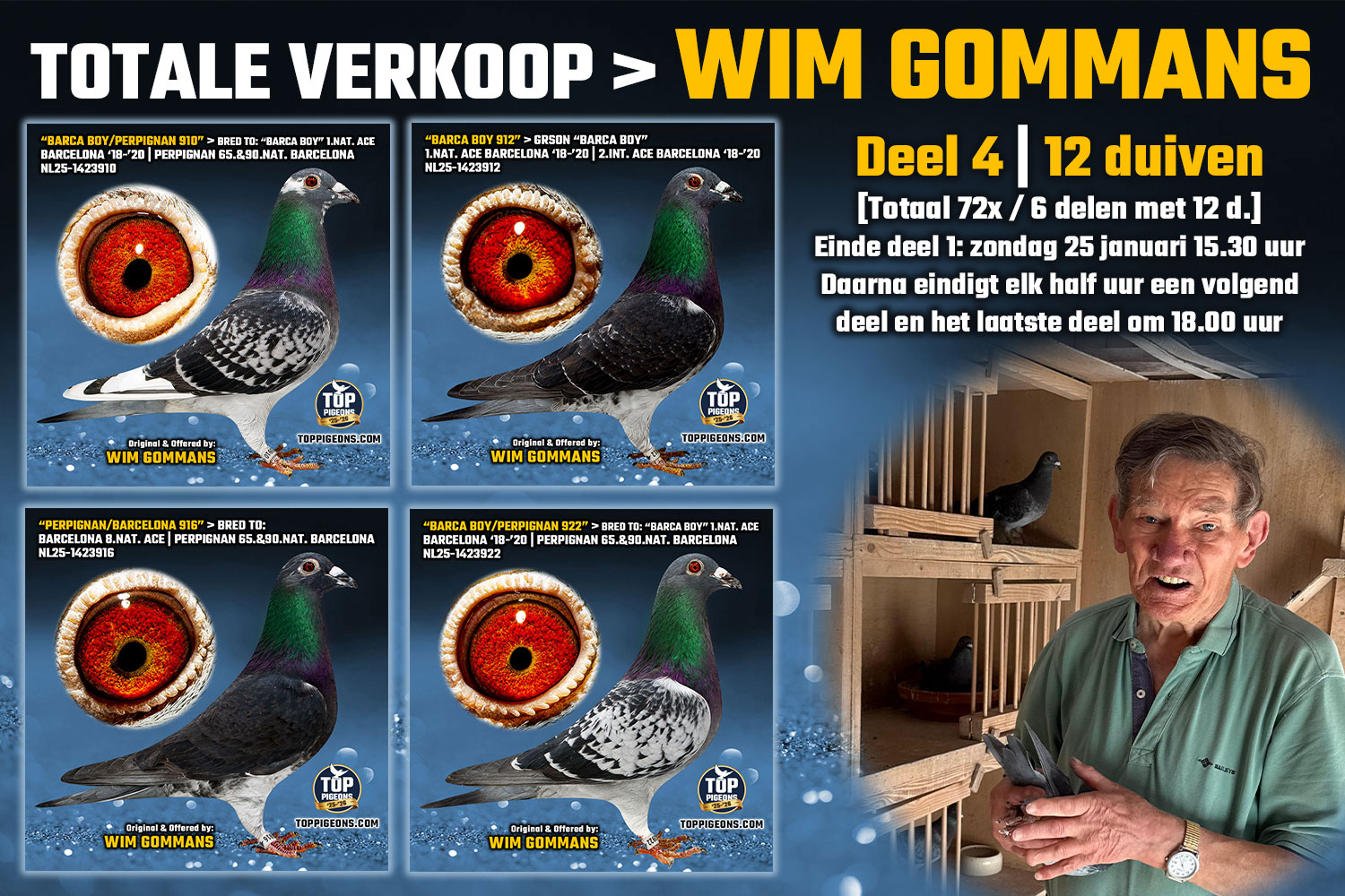 Ik, André van Boxtel, heb in 2023 direct geschakeld op de situatie van Wim Gommans en de duiven opgehaald (zomer 2023) en in opslag genomen. Pas maanden later zijn de duiven verkocht. Top Pigeons had zijn stamboomprogramma op USB gezet en de stambomen wat meer in detail uitgewerkt. Die USB is verloren gegaan en nu hebben we voor de duiven die door Wim zijn gekweekt na 2023 de originele stambomen van Wim Gommans gebruikt. Neem dus af en toe wat extra tijd om de stambomen goed te bestuderen want u zult menigmaal de basis top duiven van Wim terugzien in de pedigrees van de aangeboden duiven.
