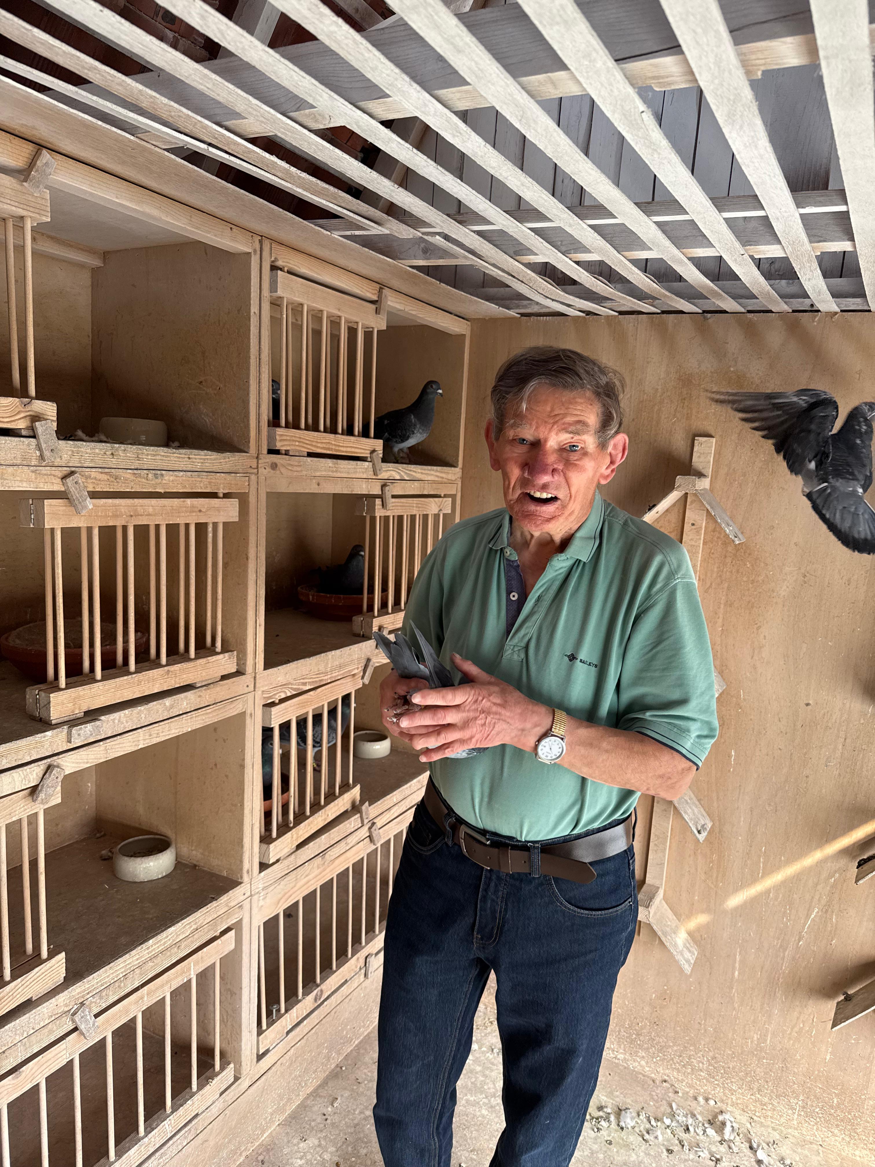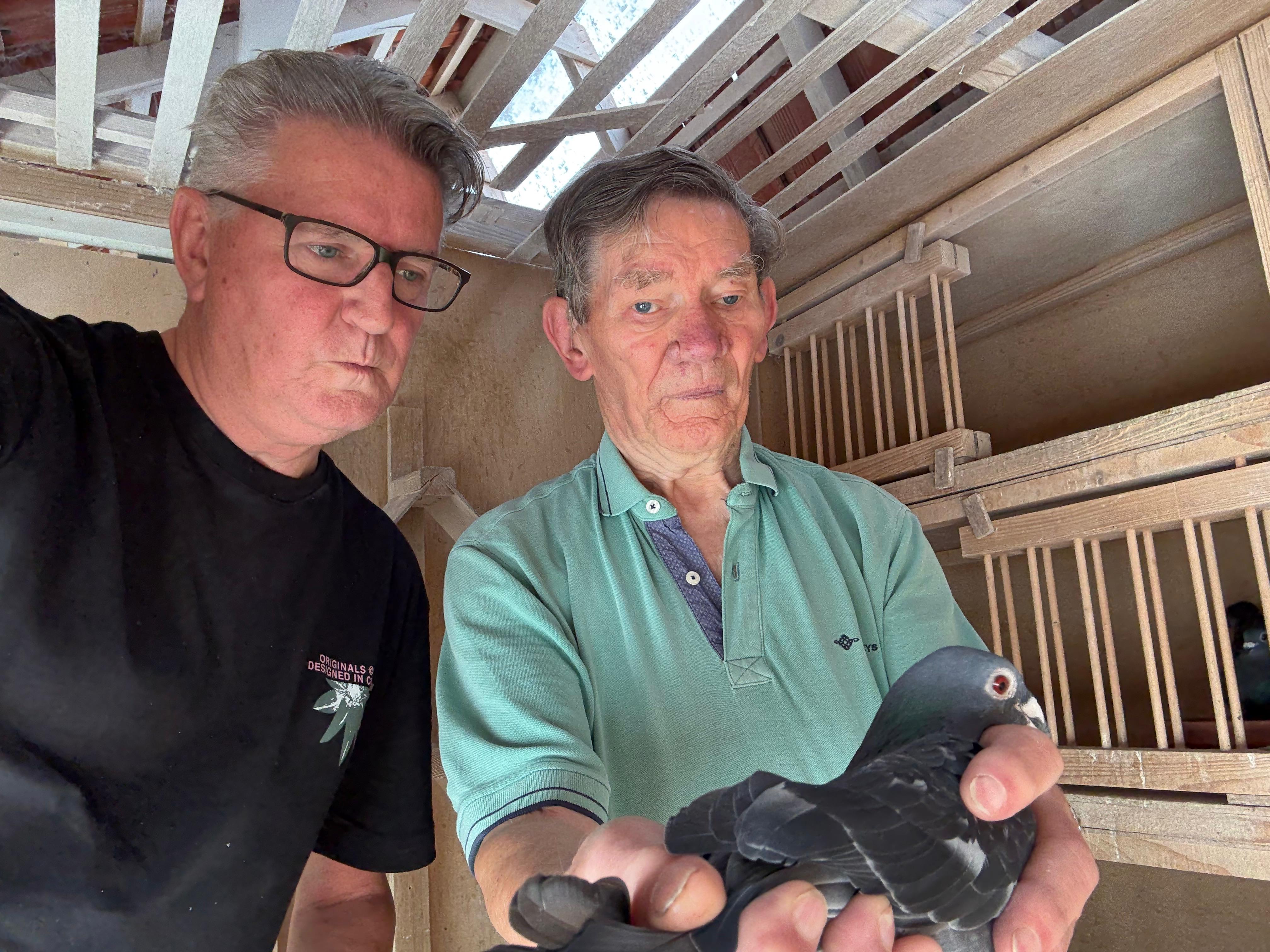 In het najaar kreeg ik een telefoontje van Wim Gommans met de vraag of ik voor hem zijn eindverkoop wilde gaan verzorgen. Ik ben op bezoek geweest bij Wim en we hebben met zijn tweeën de tijd genomen om alles goed door te nemen. Ik heb zijn handgeschreven boekwerk meegekregen en hierop staat alles keurig genoteerd. Elke duif die werd geringd in de jaren 2024 en 2025 staan hier met de ouders zorgvuldig opgeschreven. Wim is heel precies in alles met zijn duiven. Ik was samen met hem in zijn hokken en de duiven zaten hier en daar nog op stenen eitjes. Alhoewel Wim met zijn 85 jaar en wat broze gezondheid zijn beperkingen heeft kent hij elke duif en heeft er een even schitterende als liefdevolle band mee. Voor hem gaan ze niet opzij, Wim pakte er een paar eenvoudig uit het broedhok om ze aan mij te laten zien.