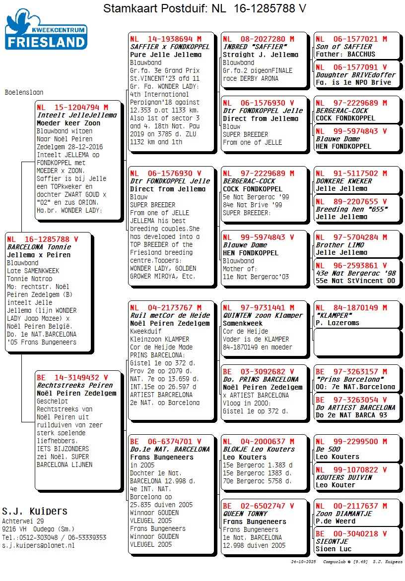 Deze duivin komt uit een inteelt Jellema duivin 'Fondkopppel' (14-1938694 (zoon 06-930) keer 06-1576930 dochter Fondkoppel)van het Kweekcentrum en een rechtstreekse Jos Pepping.