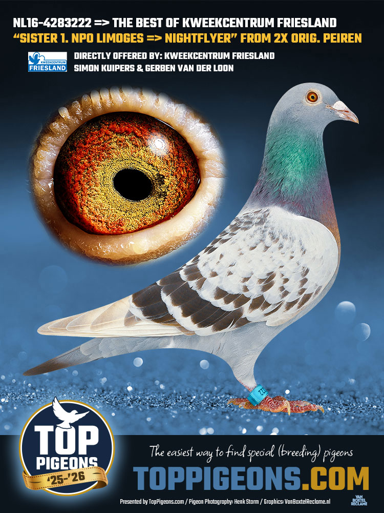 All pigeons offered in the Kweekcentrum Friesland auction up to and including 2025 have laid their eggs normally, and all the cocks have fertilized. If you would like to purchase an old pigeon from 2015 and/or 2016 and do not wish to fertilize it in 2026, we will provide you with a free young pigeon from 2026 from the breeders of Simon Kuipers. You must register yourself in 2026 by sending an email to Simon Kuipers: