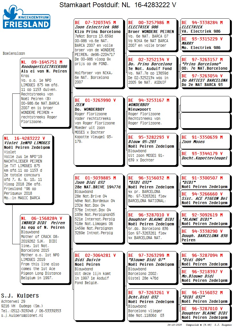In 2018 13e zone 4 NU op Periqueux 965 km op 1.269 d. Haar vader de 09-1645751 Roodoger ELECTRIEK komt als ei rechtstreeks van Noël Peiren. Hij komt uit de lijn van NIKA, 6e NAT. BARCELONA tegen 12.612 duiven en de `Wondere Peiren`, hij werd in 1999 1e WERELD KAMPIOEN. De vader (B 2007-3203345) is een halfbroer van `NIKA`. Deze duivin won in 2007 de 6e NAT. BARCELONA tegen 12.612 duiven. In 2009 vloog een dochter van `NIKA` de 1e Internationaal SOUSTONS op 10.947 jaarse duiven. De ELECTRIEK 986 is een volle broer van de WONDERE PEIREN, de 1996-2204717. De `Wondere Peiren` werd in 1999 1e WERELD KAMPIOEN en 1e N.P.O GROTE FOND. Deze doffer vloog: 8e NAT. St. Vincent, 12e NAT. Dax, 6e NAT. Bergerac. De `ELECTRIEK 986` vloog 9 x prijs op de FOND. Hij was gekoppeld aan de dochter van de `PRINS BARCELONA`, de B 2002-3252134. Zij was in 2005 3e NAT. ASDUIF GROTE FOND. De B 2002-3252134 vloog: 2004 Perpignan Nat. 271e tegen 6.489 duiven. 2005: Barcelona. Gistel 4e tegen 409 duiven. Prov. 7e op 1.936 duiven. Nat. 37e op 12.998 duiven. Perpignan Gistel 14e op 280 duiven. NAT. 194e op 7.611 duiven. INT 524e op 17.653 duiven. `Prins Barcelona` vloog op Barcelona 2000: NAT. 7e op 13.659 duiven. Gistel 1e op 372 duiven. Prov. 2e op 2.079 duiven. INT. 15e op 26.597 duiven. De moeder komt uit een rechtstreekse doffer van Roger Florizoone te Nieuwpoort (B), uit zijn `WONDERBOY`. Haar moeder komt uit zoon MOSES x Dochter Kapotte Vleugel 93-179. De moeder 06-1568284 Inteelt `DIDI` Peiren komt als ei rechtstreeks van Noël Peiren. Haar vader is een volle broer van Noël zijn 1e Nat. Barcelona 2015. Tevens zit de lijn van de 1e Asduif Fond van België in de afstamming. Simon Kuipers werd met de 2008-2019262 in 2010 1e duifkampioen op de dagfond van VVD. Deze doffer vloog van 550 km. tot 700 km. prijs en was van de 6 dagfond vluchten 5 keer eerste op het hok. Totaal 15 keer prijs van 500 t/m 1000 km. Vloog als jaarling 3 keer 1e op het hok. Nestzuster ook 3x kop waarvan 1 keer op 1000 km, en 1e van het hok. Patrick Philips ( reporter van Duifke Lacht) heeft een volle broer van deze duivin en deze doffer vloog diverse 1e prijzen in groot verband en er is ook meerdere malen in artikelen over gepubliceerd.