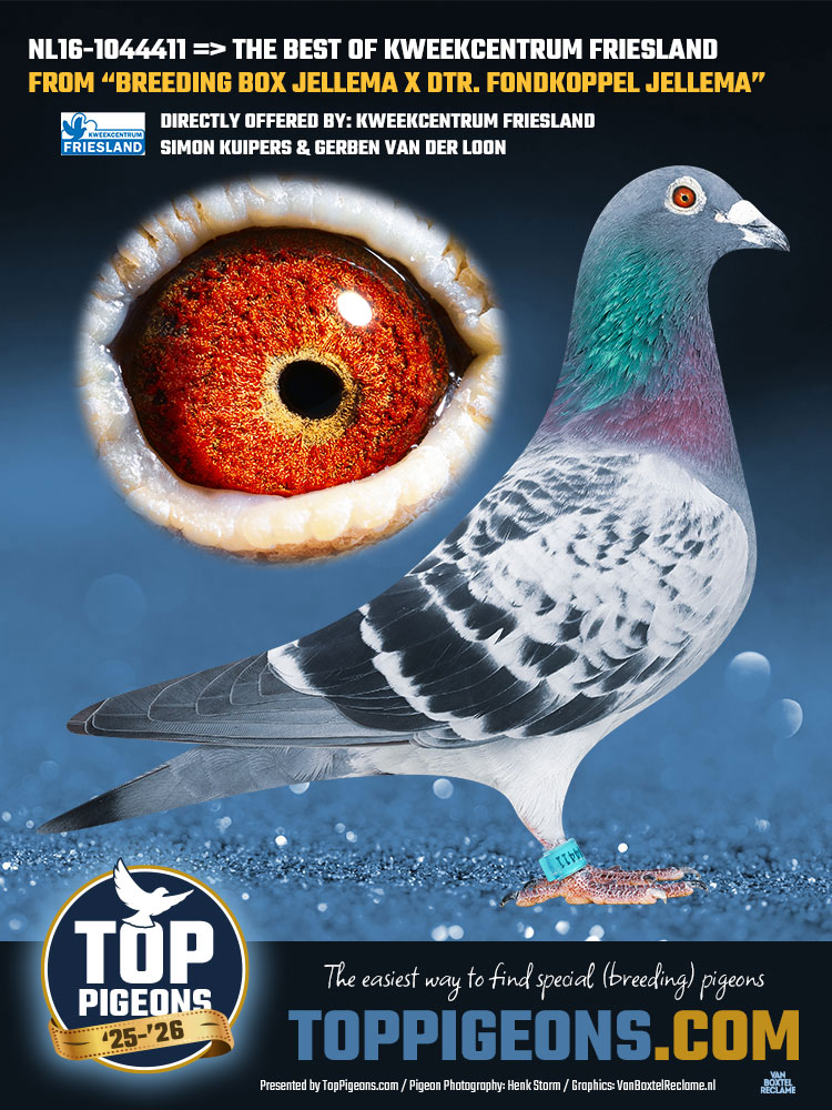 De 16-1044411 is een JELLEMA TOPKWEKER en o.a. vader van de NL20- 1058512. Zij vloog 2021: 4x op de dagfond 3x prijs. 2022: In totaal 11x mee op alle vluchten en vloog 10x prijs. Op Sens speelde ze de 1e in VVD op 170 duiven. 4x mee op de dagfond (tot 743 km) en 3x prijs. 2023: 2x mee op de marathon en 2x prijs.