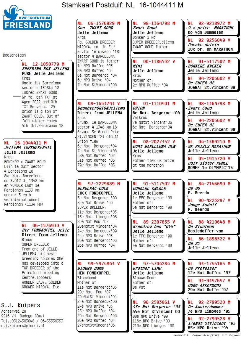 De vader van de 09-1653743 is `ORION`. Hij is een zoon uit `ZWART GOUD` keer `De 02`. De `ORION` vloog o.a.: 7e Nat. St. Vincent 2006. 6e Nat. Bergerac 2004. 48e Nat. Ruffec 2002. 51e Nat. Ruffec 2006. 79e Nat. Ruffec 2005. Ook in deze stamboom zitten weer het `FONDKOPPEL` en `ZWART GOUD` en de `ORHAN` lijn. De 06-1576930 komt rechtstreeks van JELLE JELLEMA uit zijn `FONDKOPPEL`. Met verschillende doffers kweekt zij geweldig. WONDER LADY, de “333” van Jaap Mazee won in 2018 de 1e Perpignan 1133 km sector 3 en 4 en 4e Internationaal. De ‘333’ komt uit de dochter van de 06-1576930 x haar zoon.