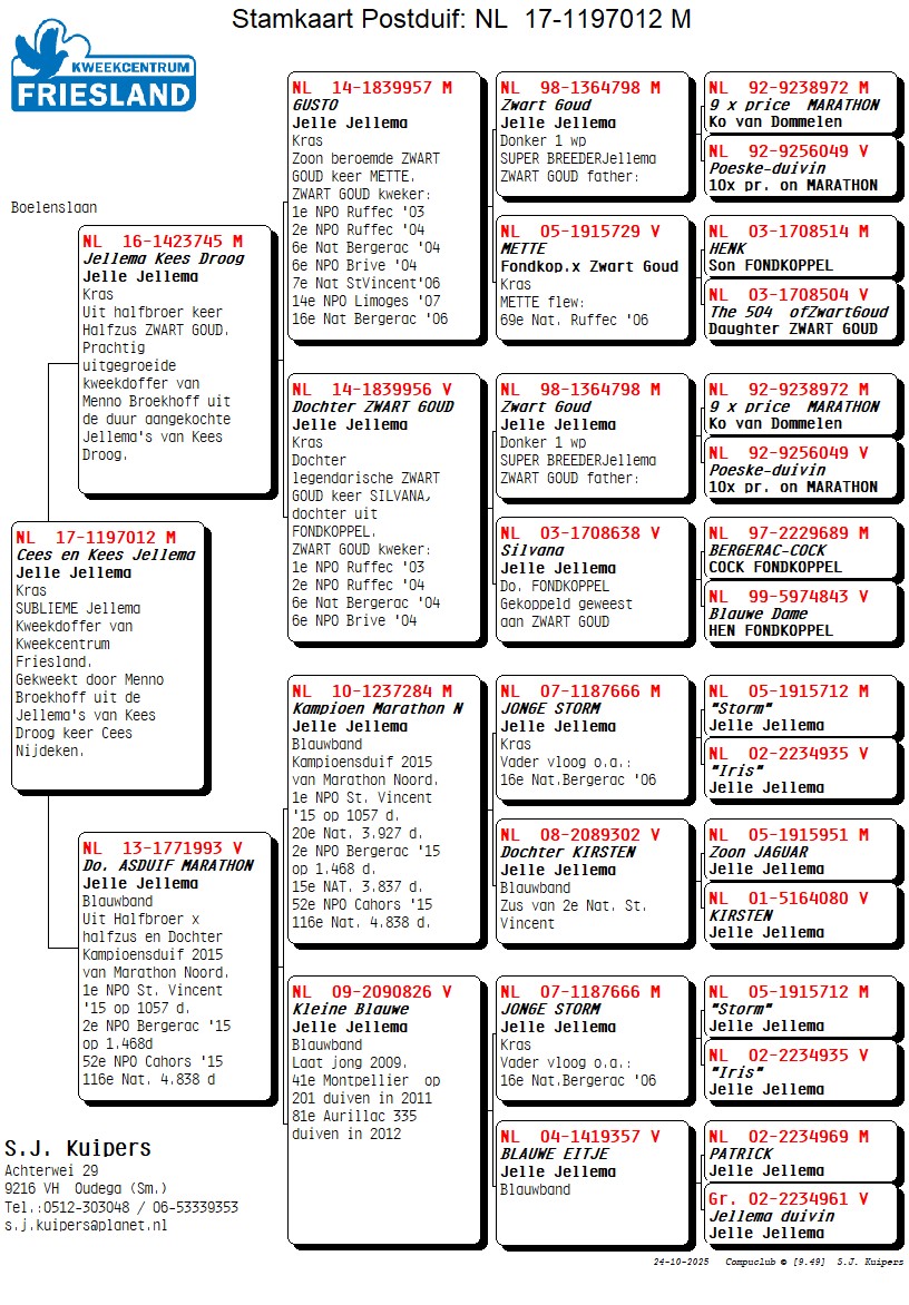 De 17-1197012 Jellema Kweekdoffer is gekweekt door Menno Broekhoff uit Jellema`s van Kees Droog keer Cees Nijdeken. Prachtig uitgegroeide kweekdoffer van Menno uit de duur aangekochte Jellema`s van Kees Droog. De 16-1423745 komt van Kees Droog uit halfbroer keer halfzus van ZWART GOUD. SILVANA is een dochter uit het beroemde FONDKOPPEL. METTE komt weer uit een dochter van Zwart Goud. Mette vloog: 69e Nat. Ruffec `06, 472e Nat Bergerac 08, 600e Nat Bergerac 07, 622e NPO Limoges `06. Ze is moeder van o.a. 12e NAT. Bordeaux `09. ZWART GOUD kweker van vele toppers zoals 1e NPO Ruffec `03, 2e NPO Ruffec `04, 6e Nat Bergerac `04, 6e NPO Brive `04, 7e Nat St. Vincent `06, 14e NPO Limoges `07, 16e Nat Bergerac `06, 24e Nat. Bergerac `04, 24e Limoges op 3932 duiven, 29e NPO Brive `03. De 13-1771993 komt uit halfbroer x halfzus en is een dochter Kampioensduif 2015 van Marathon Noord. De Kampioensduif Marathon Noord vloog: 1e NPO St. Vincent `15 op 1.057 duiven. 2e NPO Bergerac `15 op 1.468 duiven. 52e NPO Cahors `15 en 116e Nat. 4.838 duiven.