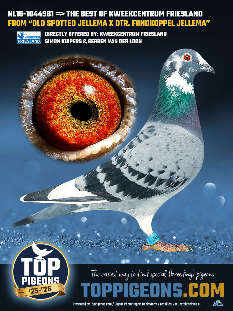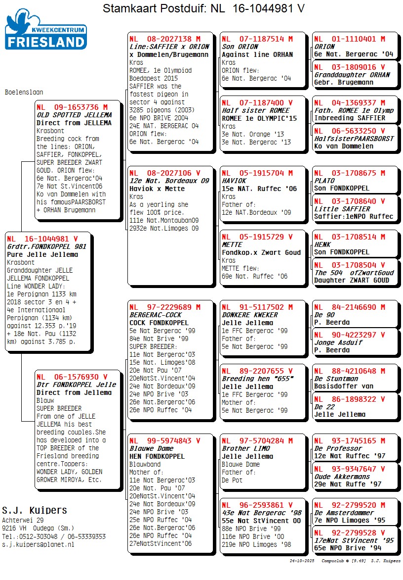 Deze duivin komt uit een inteelt Jellema duivin 'Fondkopppel' (14-1938694 (zoon 06-930) keer 06-1576930 dochter Fondkoppel)van het Kweekcentrum en een rechtstreekse Jos Pepping.