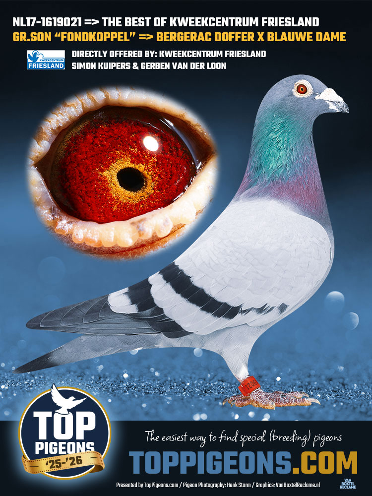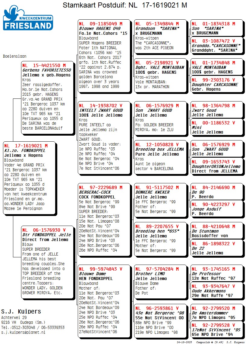 De 17-1619021 is vader van HILTSJE Nachtvlieger NL19-1218826 de 4e GRAND PRIX `21 Bergerac/Libournes 1037 km op 2280 duiven en 10e TXT 965 km `21 Periqueux op 1055 duiven. De vader 15-4421550 is één van onze favoriete kweekdoffers en komt uit het beste van Jelle Jellema keer onze succesvolle gebr. Hagens lijn. De 09-1185049 is ook vader van de 1e Nat. Cahors (1056 km) 2015 en van SONJA, 6e TXT CAHORS 2017. Een pure familieteelt op de basislijnen v.d. gebr. Hagens. In de stamboom zitten `Sarina` (Gouden Barcelona duif over 3 jaar), `Lucinda` (6e NAT. Barcelona), `Carcassonne` (2e ASDUIF ZLU) en de `Vale Montauban`. Uit de nestbroer van de 09-1185049, de 09-050 komt Simon zijn beste vliegduivin `Pareltje Hagens` die o.a. 9e Teletekst op Dax (1168 km) vloog. In 2020 vloog SUPERTJE uit 2x TXT (18-1431131) 3x mee op de fond waarvan 3x prijs en 8e Teletekst Bergerac (1005 km) zone 4 NU. De 14-1938702 is sterk ingeteeld op Zwart Goud. De 06-1576929 is een rechtstreekse zoon van Jelle zijn `ZWART GOUD` keer `MINI`. Dit is onze Jellema STAMDOFFER. Hij was gekoppeld met de 12-1050828, dat is zijn eigen dochter x een dochter van de ORION. De ORION is ook weer een zoon van ZWART GOUD. De moeder 06-1576930 komt uit Jelle zijn BASISKOPPEL, het zgn. `FONDKOPPEL`. Dit is een super kweekduivin. Haar vader is de `BERGERAC-doffer`, hij vloog o.a.: 1e FFC Bergerac 1999. 5e Nat Bergerac 1999. 84e Nat Brive 1999. Tevens is hij de vader van: 11e Nat. Bergerac 2003, 20e Nat. St. Vincent 2004, 24e NPO Brive 2003, 26e Nat. Bergerac 2006, 26e NPO Ruffec 2004, 27e Nat. St. Vincent 2006, 28e Nat. Bergerac 2005. De moeder is de `BLAUWE DAME` en zij kweekte: 11e Nat. Bergerac 2003. 20e Nat. St. Vincent 2004. 24e NPO Brive 2003. 25e NPO Ruffec 2004. 26e Nat. Bergerac 2006. 26e NPO Ruffec 2004. 27e Nat. St. Vincent 2006. 28e Nat. Bergerac 2005. Ze is ook de moeder van GOUDEN KWEKER MIROYA, moeder 1e ZLU Agen Noord 2015 en grootmoeder van `WONDER LADY, zij vloog 1e Perpignan 1133 km sector 3 en 4 en 4e Internationaal tegen 12.353 d. 2018 en 1e Nat. Pau sector 4 en 18e Nat. Pau 1132 km ZLU. 3785 d. 2019 van Jaap Mazee.