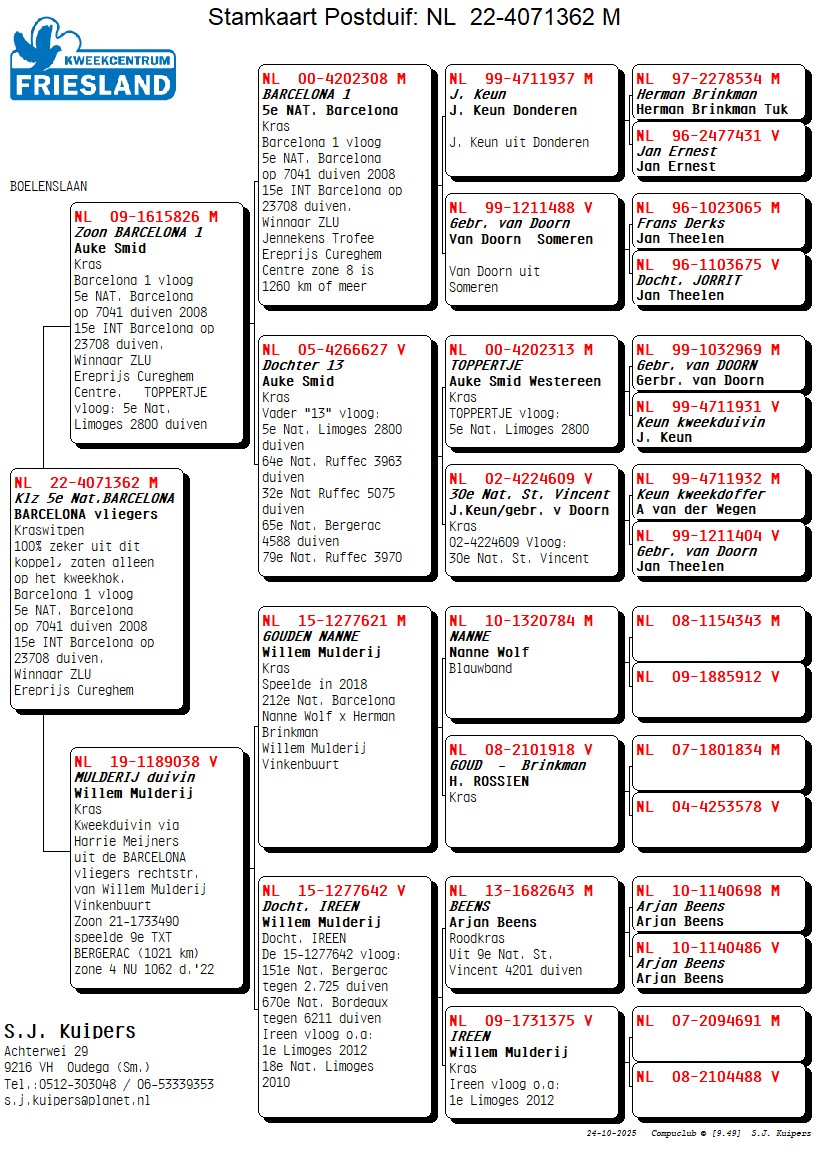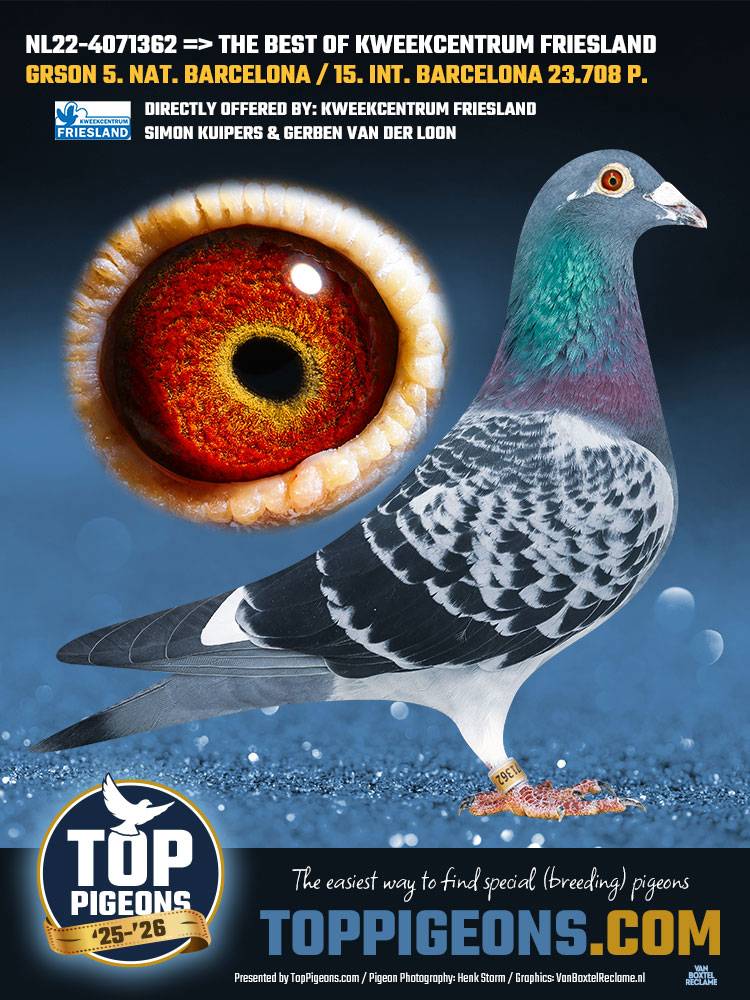 NL22-4071362 kraswitpen doffer. Kleinzoon van de beroemde Barcelona 1 van Auke Smid uit de Westereen (Zwaagwesteinde). Zijn Barcelona duiven vlogen op Barcelona 1354 km! Zijn NL00-4202308 BARCELONA 1 vloog 5e NAT. Barcelona op 7041 duiven 2008, 15e INT Barcelona op 23708 duiven. Winnaar ZLU Ereprijs Cureghem Centre. TOPPERTJE vloog: 5e Nat. Limoges 2800 duiven